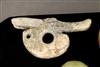 THREE CHINESE HONGSHAN CULTURE PENDANTS. Lot comprising of three patinated and incised (1) A beige jade zhulong, pig dragon with a long nose. Hongshan culture. Width: 10.3 cm, 4.1/16 inches. (2) A yellowish green and russet jade of a bird with outstretched wings. Hongshan culture. Height: 8 cm, 3 1/16 inches. Reference: Jessica Rawson "Chinese Jades from the Neolithic to the Qing" p. 117, fig. 1:5. And (3) A light green and russet jade zhulung, pig dragon. Hongshan culture. Height: 7.3 cm, 2 7/16 inches; Reference: Jessica Rawson 'Chinese Jades from the Neolithic to the Qing", 1995 p. 116, fig 1:4. Note: The Hongshan culture was a Neolithic culture in the West Liao River basin in northeast China. Hongshan sites have been found in an area stretching from Inner Mongolia to Liaoning, and dated from about 4700 to 2900 BC. NOTE: A copy of the consignor's purchase receipt will be provided upon request. Estimate $600-800 PROVENANCE: Acquired in the early 1990s from Frank H. Crane's "The Hundred Antiques" store (Stirling, Ontario, Canada). Mr. Crane was a frequent visitor to Hong Kong where he acquired Archaic jades mainly from Mr. Lai Loy's well known and prominent shop near the Man Mo Temple on Hollywood Road. Mr. Lai (Chinese, 1926-2012) was the descendent of antique dealers from Guangzhou, China. In 2005, stones from the collection were verbally authenticated by Dr. Sarah Milledge Nelson (American, 1931 - 2020), a noted archaeologist and Distinguished Professor Emerita from the Department of Anthropology, University of Denver.