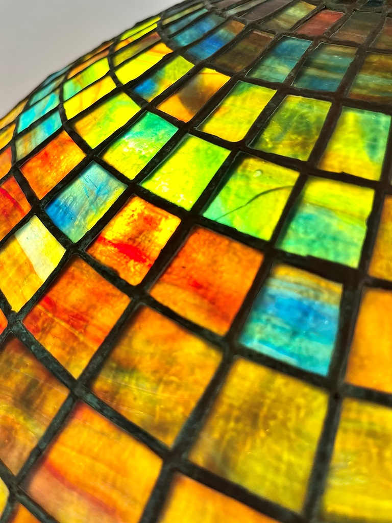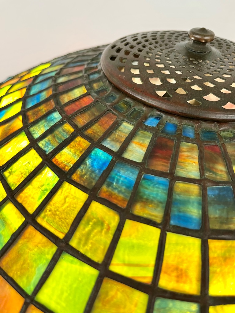 THREE-LIGHT ART GLASS TABLE LAMP AFTER TIFFANY STUDIOS. Domed shade with various color slag glass tiles. Faience base. Shade and base each spuriously signed. Overall, H: 23 in.; shade, D: 18 in.Estimate $500-1,000