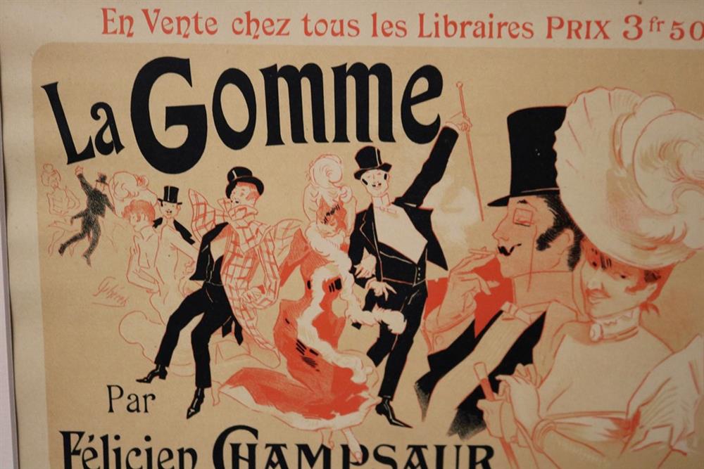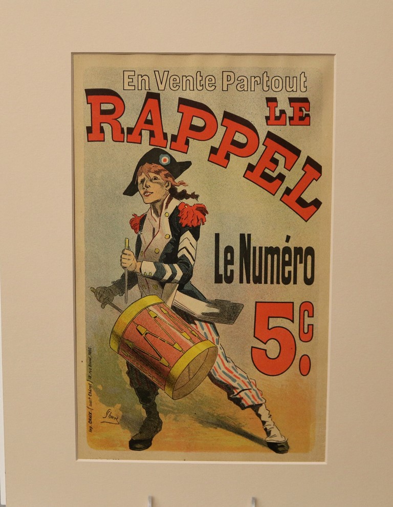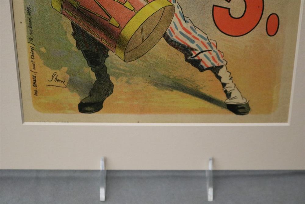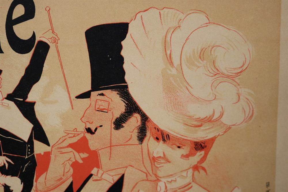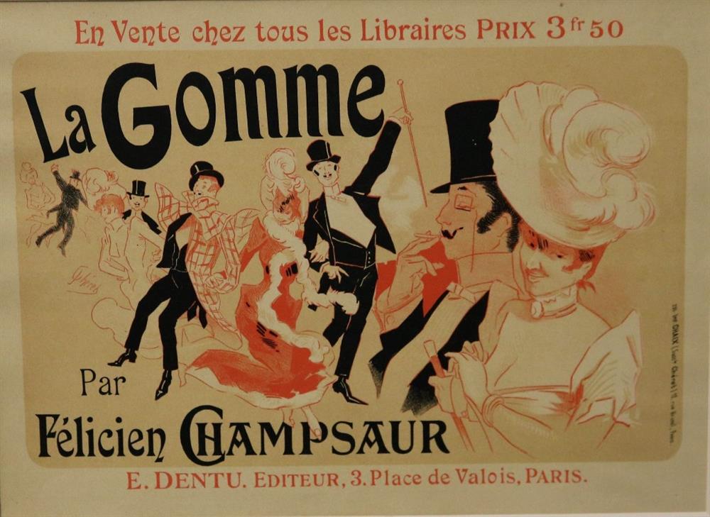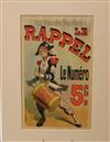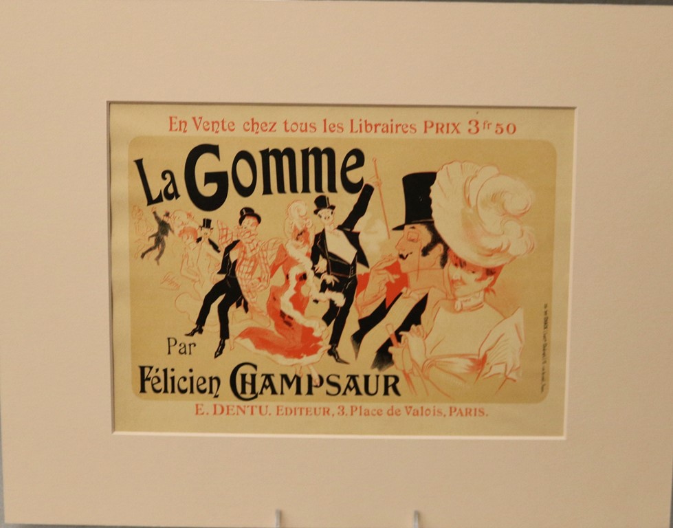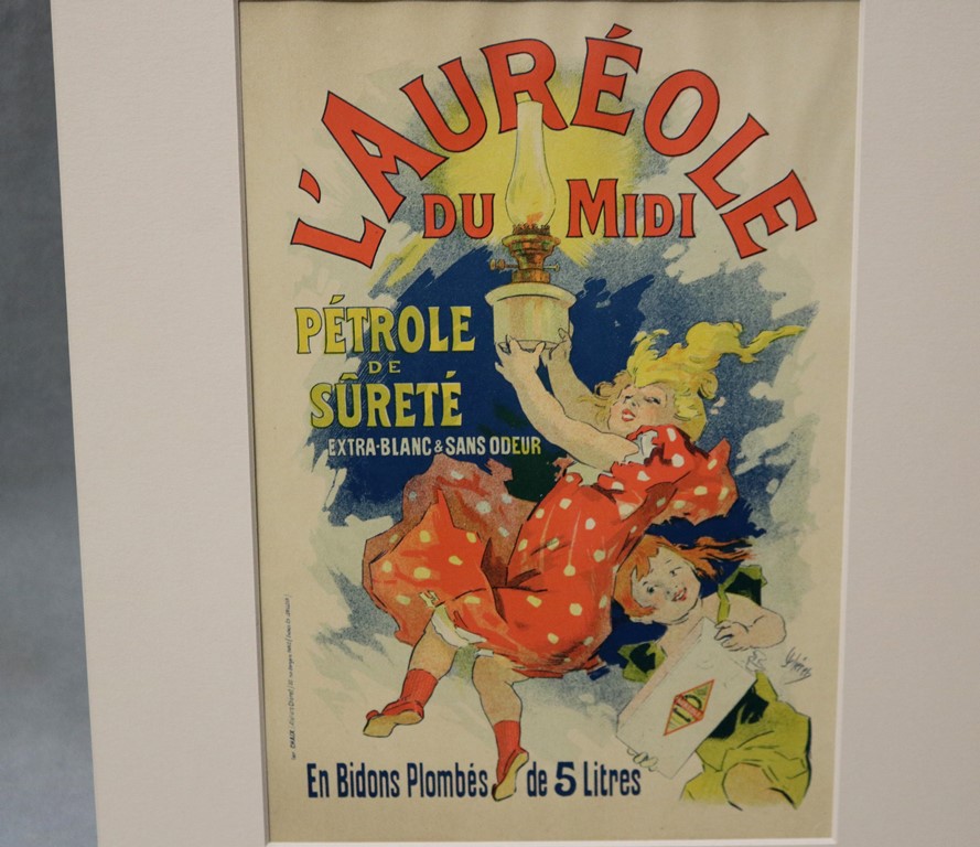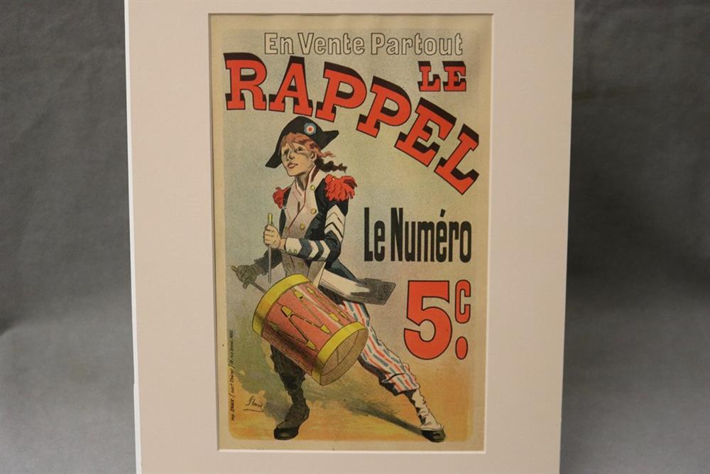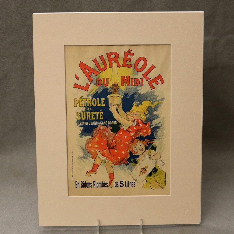 THREE SMALL-SCALE FRENCH LITHOGRAPHIC POSTERS, 19TH / 20TH century. Set of these three French small-scale posters, dating from the late 19th or early 20th century, exhibit the diverse subject matter and expressive style of Belle Époque advertising. The poster on the left promotes "L'AURÉOLE DU MIDI PÉTROLE DE SÛRETÉ" (safety kerosene), featuring a striking image of a blonde woman in a red polka-dot dress holding aloft a brightly lit kerosene lamp, illuminating a child below, emphasizing the product's safety and light quality. The middle poster advertises a publication called "LE RAPPEL," with the phrase "En Vente Partout Le Numéro 5 C" (On sale everywhere, the issue is 5 centimes), showcasing a dramatically posed figure-possibly a newsboy or street crier-beating a large drum to draw attention. The poster on the right, advertising "LA GOMME" by Félicien Champsaur, likely a book or literary work, features a lively, humorous, and somewhat grotesque scene of figures in fashionable and exaggerated attire dancing or socializing, rendered in the distinctive Art Nouveau style of the time, priced at "PRIX 3 FR. 50." Note: Unframed. None of the posters are laid down. All are mated. - various mat openings; approx: 9 x 12 inches; mat: 14 x 18 inches. Estimate $200-250