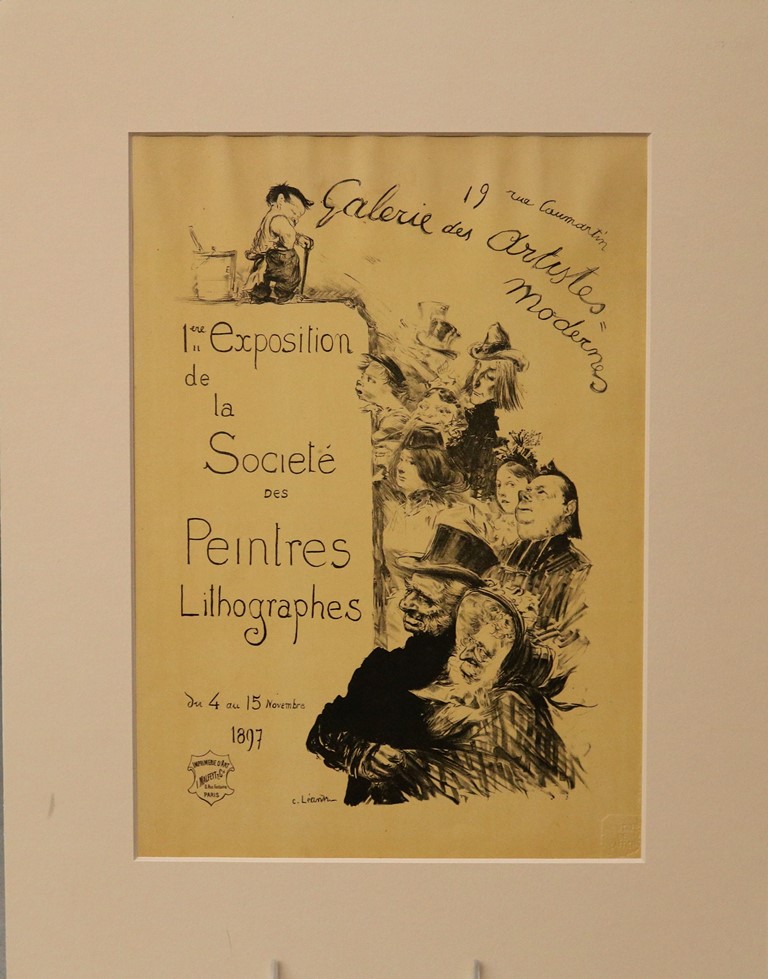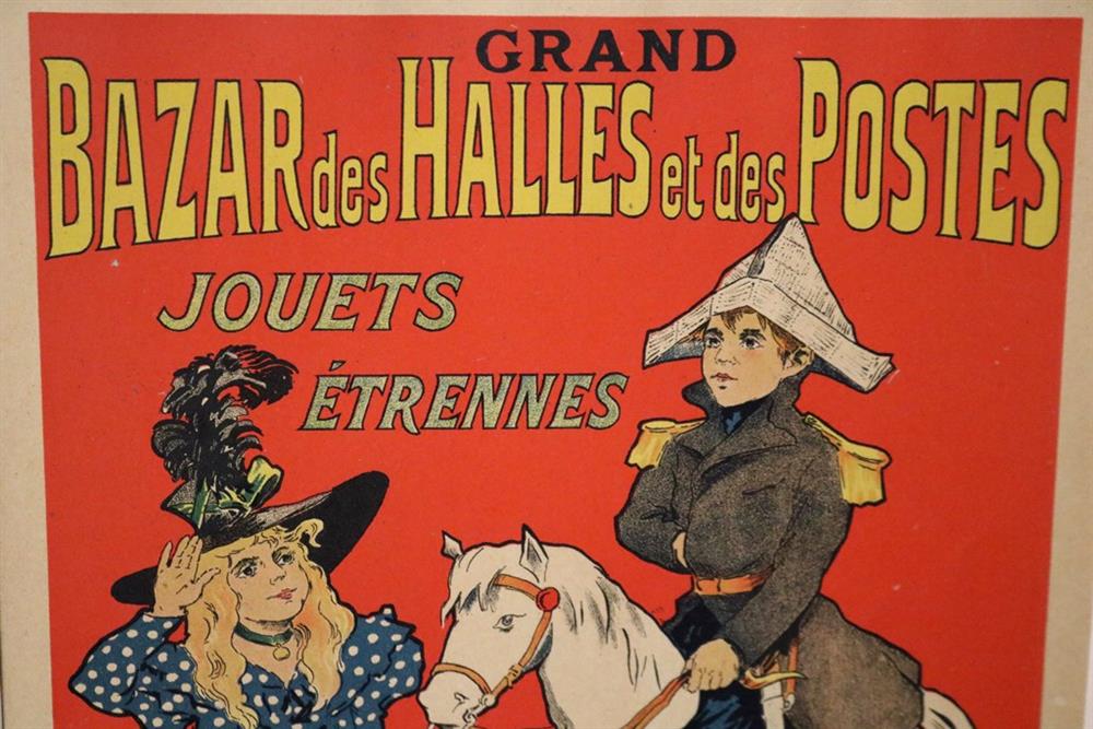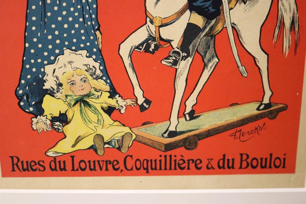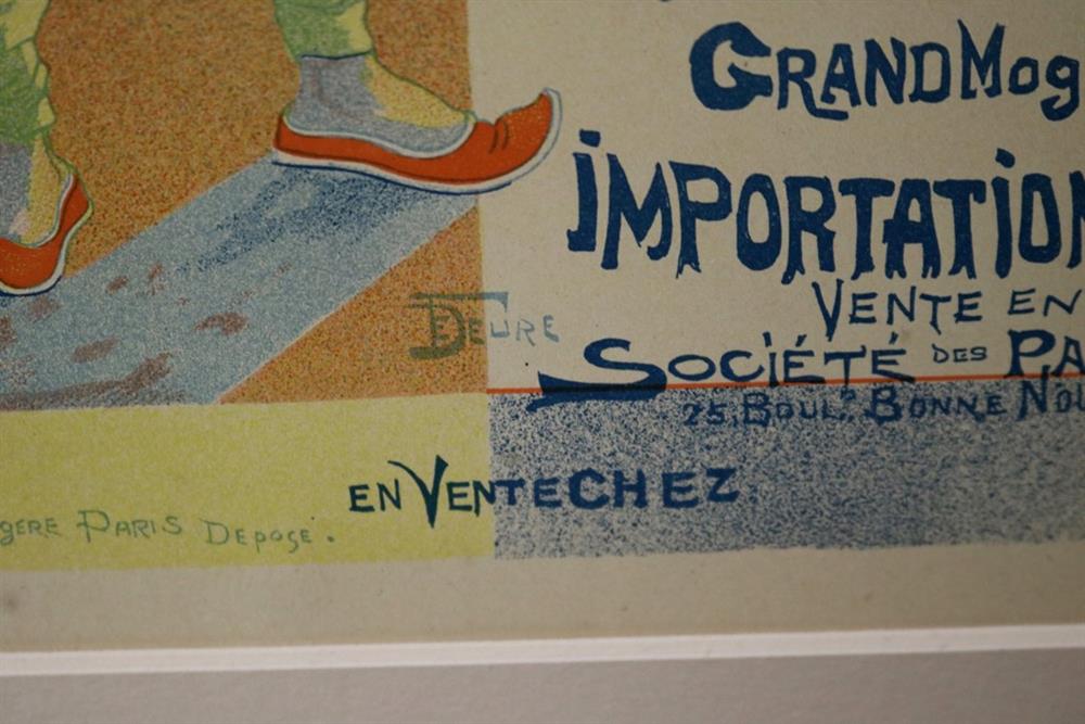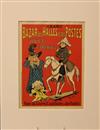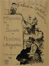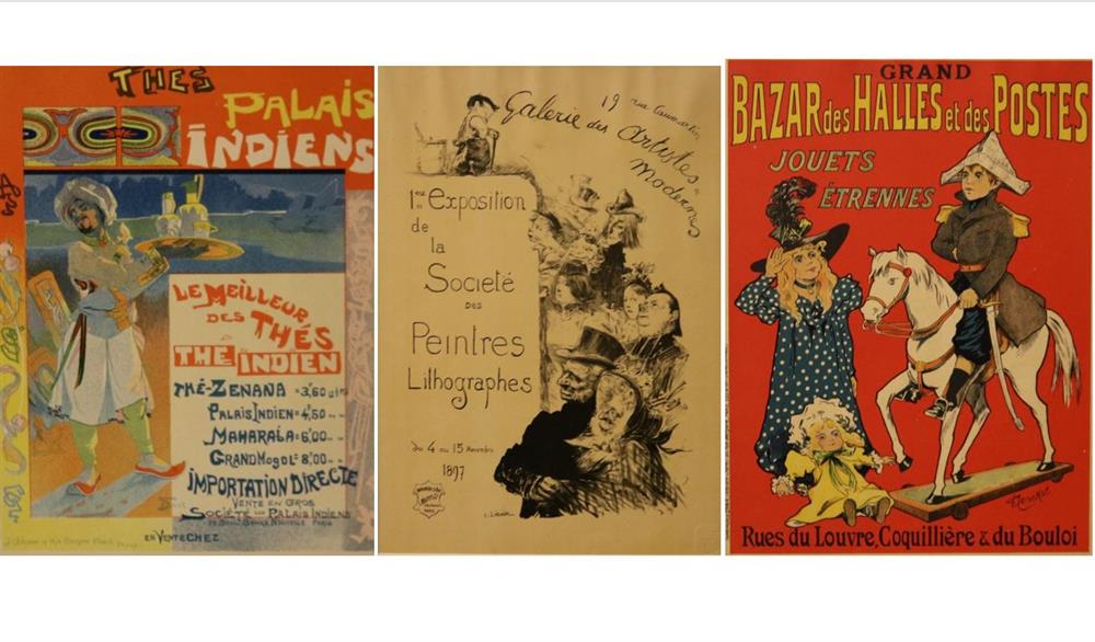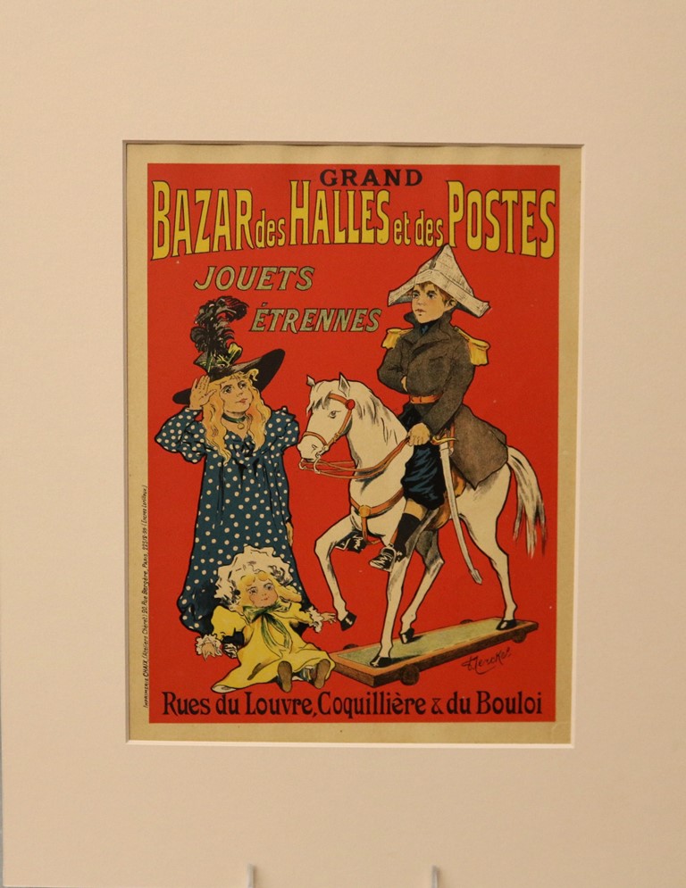 THREE SMALL-SCALE FRENCH LITHOGRAPHIC POSTERS, 19TH / 20TH century. Set of three French small-scale posters showcasing diverse commercial and cultural advertisements from the late 19th or early 20th century. The poster on the left, advertising "LES PALAIS INDIENS THES," features a highly stylized, exotic depiction of a turbaned Indian servant holding a tray with bottles, employing a warm palette of reds, oranges, and blues to promote tea with specific varieties and times ("Le Meilleur des Thés Indien"). The middle poster is a monochrome announcement for a cultural event, the "1?? Exposition de la Société des Peintres Lithographes," held at the "Galerie des Artistes Modernes," featuring a dense, lively black-and-white sketch of an artistic crowd typical of a bohemian Parisian setting. The poster on the right is a vividly colored advertisement, dominated by a bright red background, for the "GRAND BAZAR DES HALLES et des POSTES" selling "JOUETS ÉTRENNES" (Christmas/New Year's toys), depicting a charming scene of two children dressed in costume-one riding a white hobby horse and the other seated on the ground-with the store's addresses provided below. Note: Unframed. None of the posters are laid down. All are mated. - various mat openings; approx: 9 x 12 inches; mat: 14 x 18 inches. Estimate $200-250