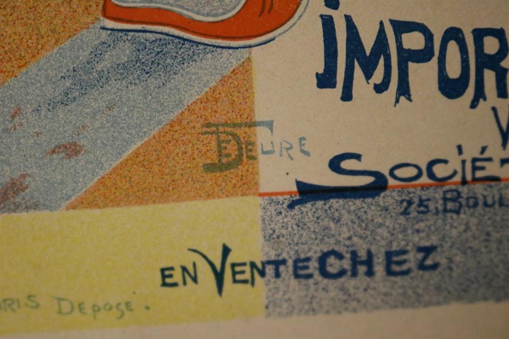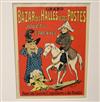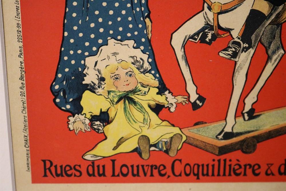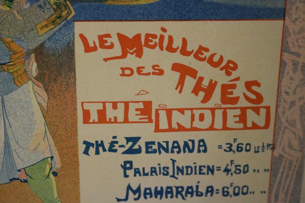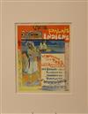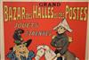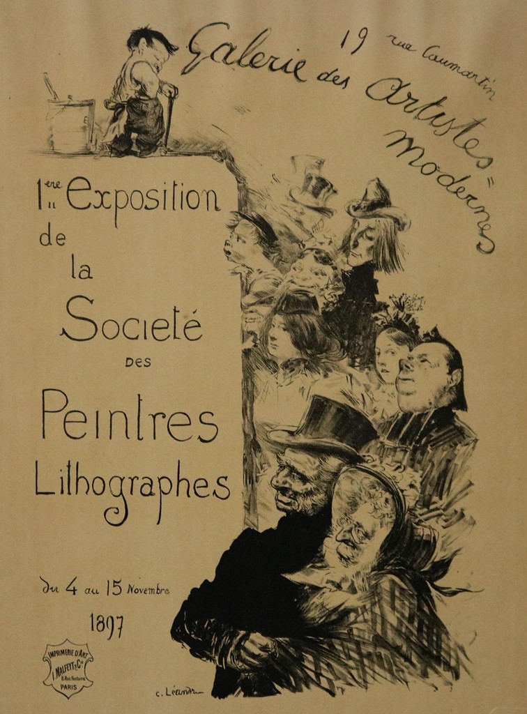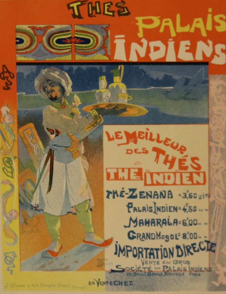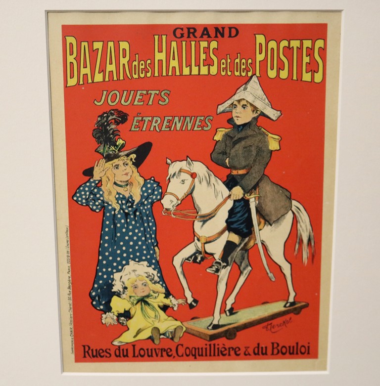 THREE SMALL-SCALE FRENCH LITHOGRAPHIC POSTERS, 19TH / 20TH century. Set of three French small-scale posters showcasing diverse commercial and cultural advertisements from the late 19th or early 20th century. The poster on the left, advertising "LES PALAIS INDIENS THES," features a highly stylized, exotic depiction of a turbaned Indian servant holding a tray with bottles, employing a warm palette of reds, oranges, and blues to promote tea with specific varieties and times ("Le Meilleur des Thés Indien"). The middle poster is a monochrome announcement for a cultural event, the "1?? Exposition de la Société des Peintres Lithographes," held at the "Galerie des Artistes Modernes," featuring a dense, lively black-and-white sketch of an artistic crowd typical of a bohemian Parisian setting. The poster on the right is a vividly colored advertisement, dominated by a bright red background, for the "GRAND BAZAR DES HALLES et des POSTES" selling "JOUETS ÉTRENNES" (Christmas/New Year's toys), depicting a charming scene of two children dressed in costume-one riding a white hobby horse and the other seated on the ground-with the store's addresses provided below. Note: Unframed. None of the posters are laid down. All are mated. - various mat openings; approx: 9 x 12 inches; mat: 14 x 18 inches. Estimate $200-250