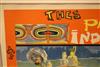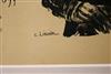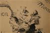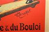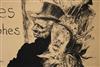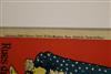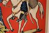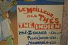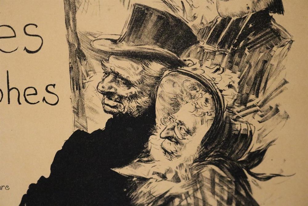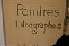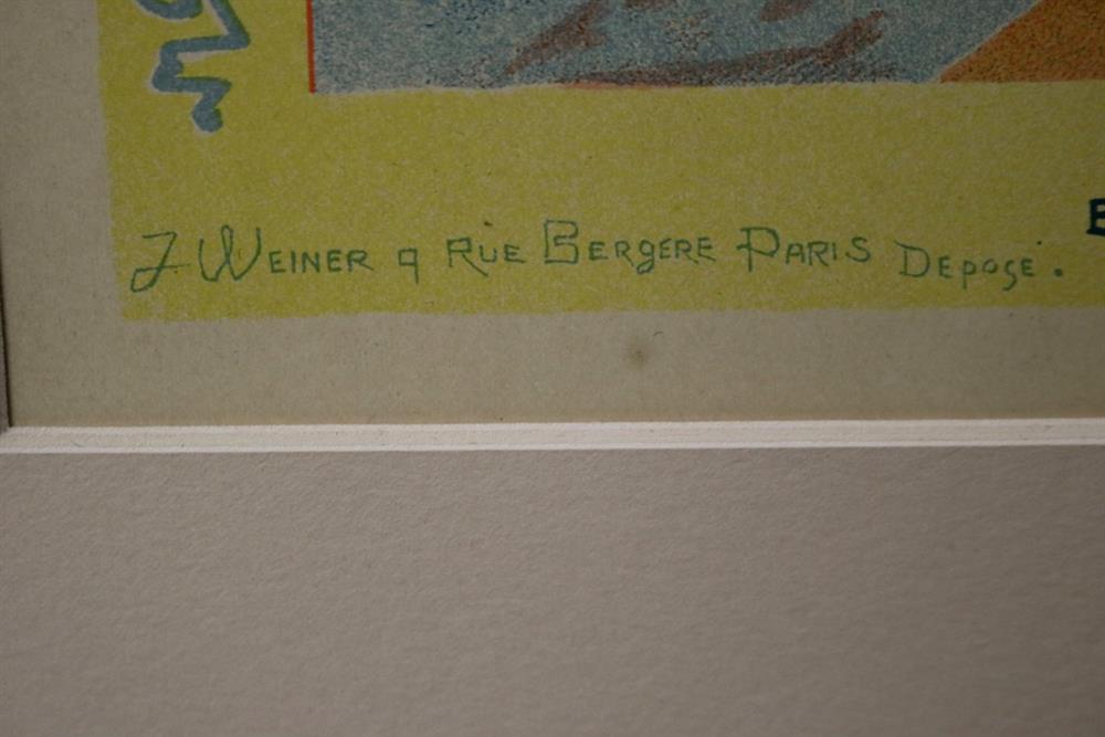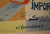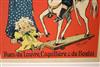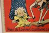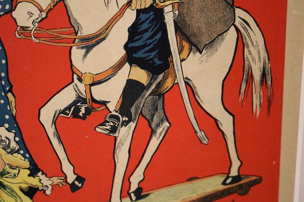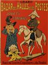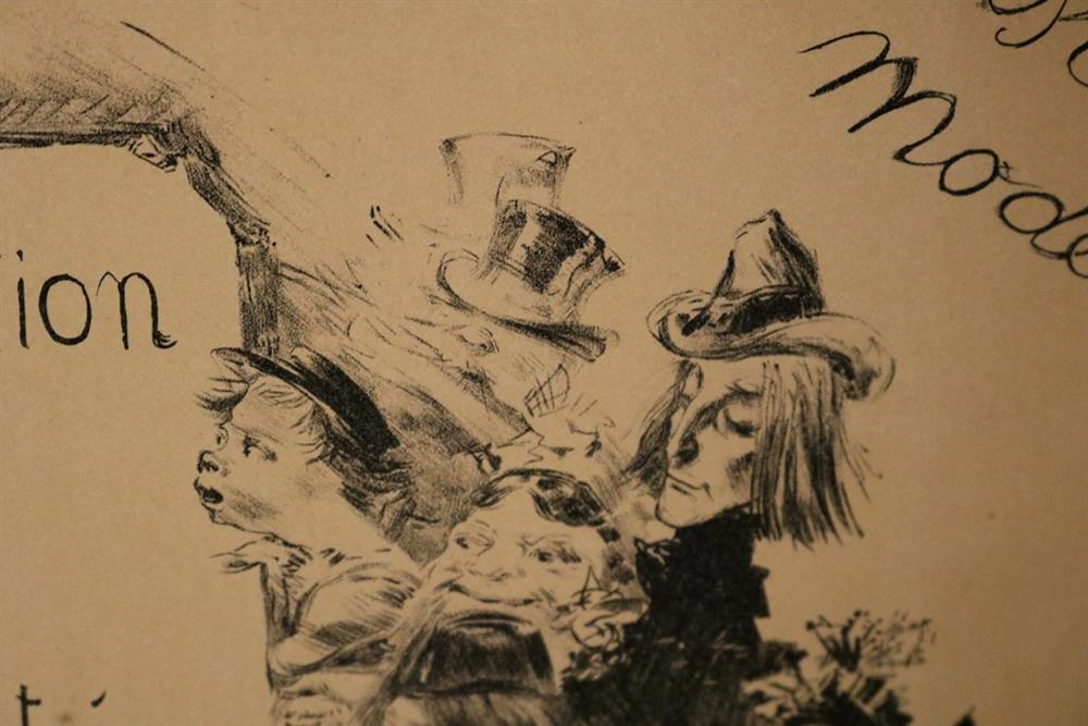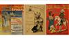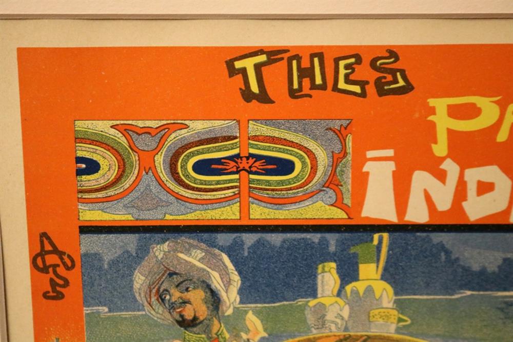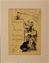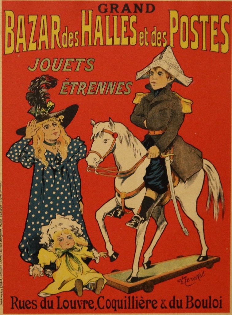 THREE SMALL-SCALE FRENCH LITHOGRAPHIC POSTERS, 19TH / 20TH century. Set of three French small-scale posters showcasing diverse commercial and cultural advertisements from the late 19th or early 20th century. The poster on the left, advertising "LES PALAIS INDIENS THES," features a highly stylized, exotic depiction of a turbaned Indian servant holding a tray with bottles, employing a warm palette of reds, oranges, and blues to promote tea with specific varieties and times ("Le Meilleur des Thés Indien"). The middle poster is a monochrome announcement for a cultural event, the "1?? Exposition de la Société des Peintres Lithographes," held at the "Galerie des Artistes Modernes," featuring a dense, lively black-and-white sketch of an artistic crowd typical of a bohemian Parisian setting. The poster on the right is a vividly colored advertisement, dominated by a bright red background, for the "GRAND BAZAR DES HALLES et des POSTES" selling "JOUETS ÉTRENNES" (Christmas/New Year's toys), depicting a charming scene of two children dressed in costume-one riding a white hobby horse and the other seated on the ground-with the store's addresses provided below. Note: Unframed. None of the posters are laid down. All are mated. - various mat openings; approx: 9 x 12 inches; mat: 14 x 18 inches. Estimate $200-250