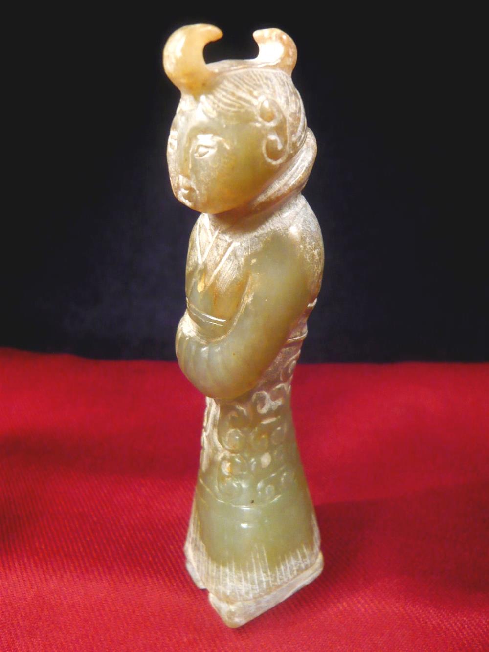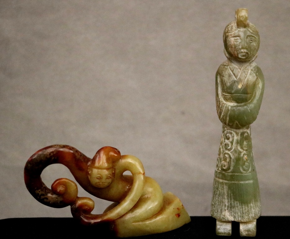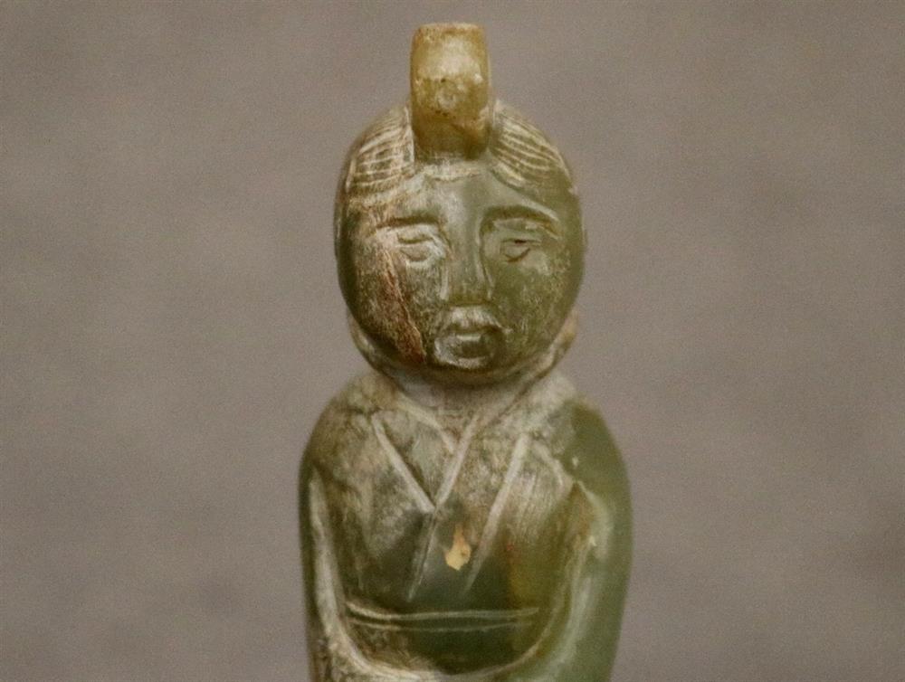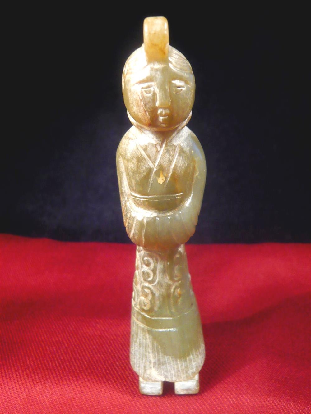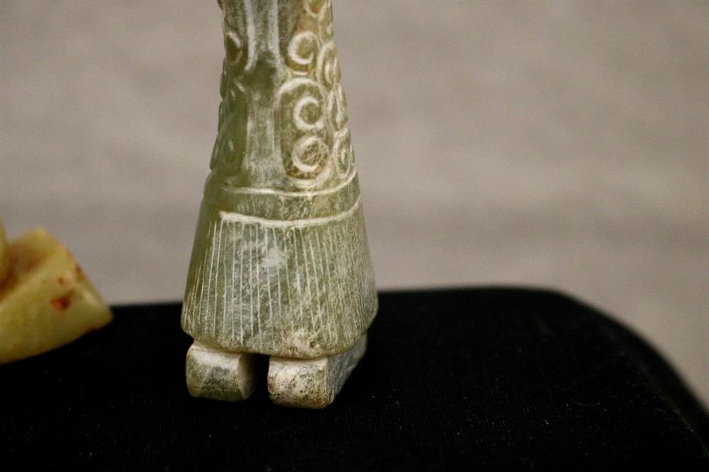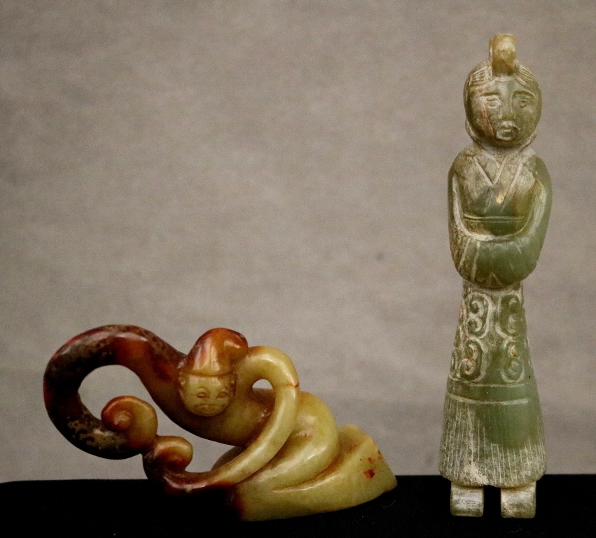 TWO CHINESE HAN DYNASTY FIGURINES. Two patinated and incised figurines as follows (1) a light green jade standing female figure. Han dynasty. Height: 13 cm, 5 2/16 inches; and (2) a light green and russet jade figure of a dancer. Han dynasty. Length: 10 cm, 4 inches. Note: The Han dynasty was a Chinese imperial dynasty that ruled from 206 BCE to 220 CE. NOTE: A copy of the consignor's purchase receipt will be provided upon request. Estimate $400-600 PROVENANCE: Acquired in the early 1990s from Frank H. Crane's "The Hundred Antiques" store (Stirling, Ontario, Canada). Mr. Crane was a frequent visitor to Hong Kong where he acquired Archaic jades mainly from Mr. Lai Loy's well known and prominent shop near the Man Mo Temple on Hollywood Road. Mr. Lai (Chinese, 1926-2012) was the descendent of antique dealers from Guangzhou, China. In 2005, stones from the collection were verbally authenticated by Dr. Sarah Milledge Nelson (American, 1931 - 2020), a noted archaeologist and Distinguished Professor Emerita from the Department of Anthropology, University of Denver.
