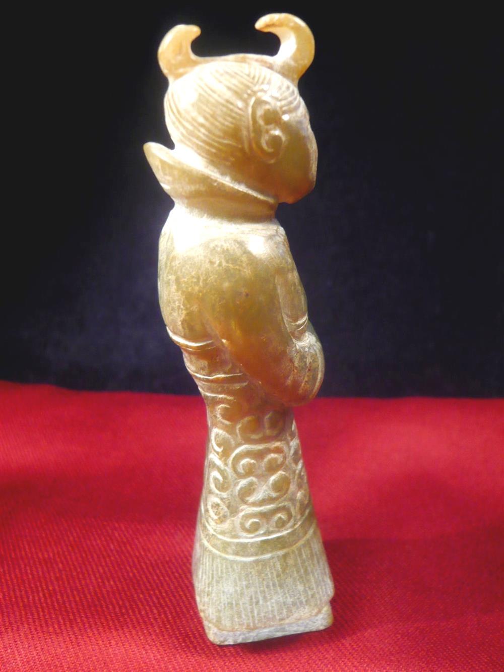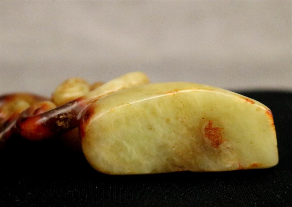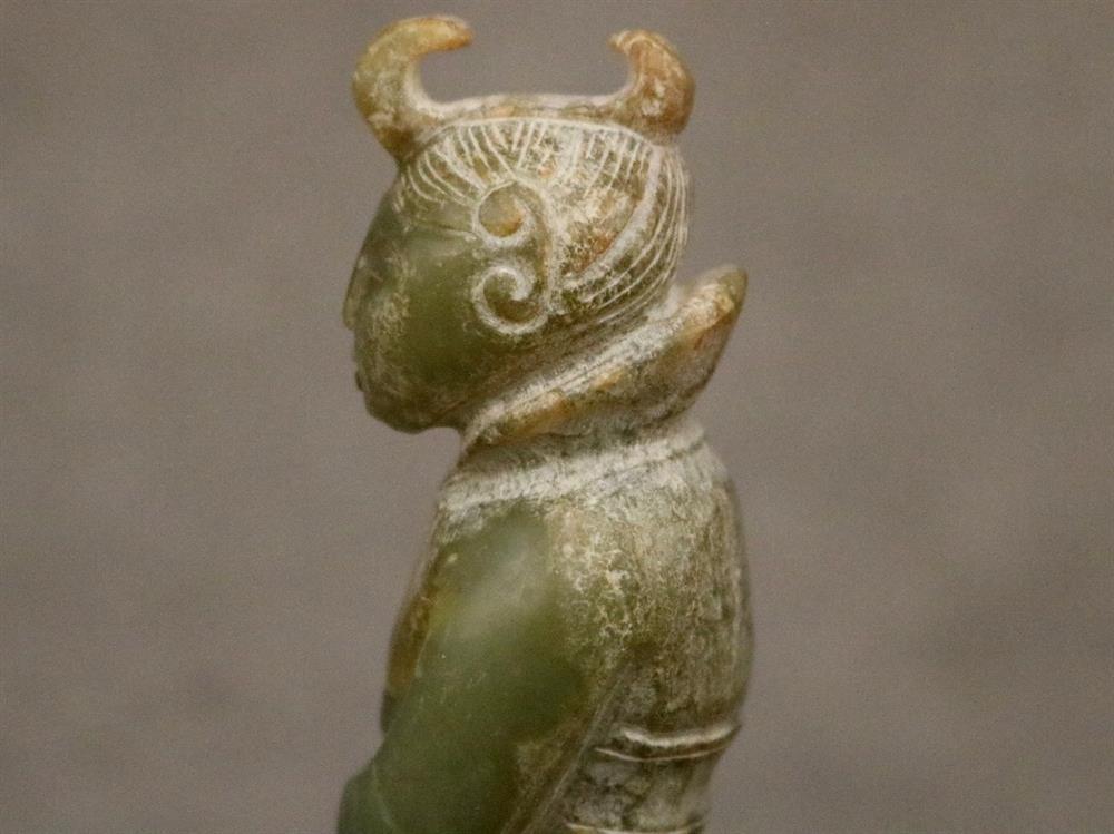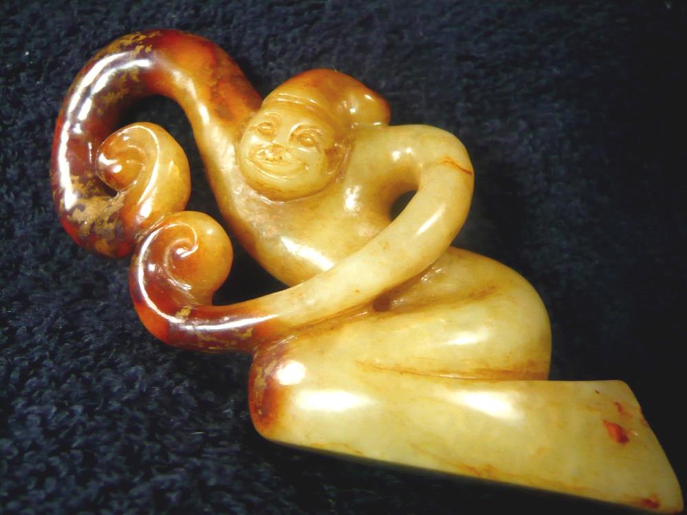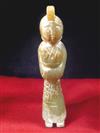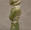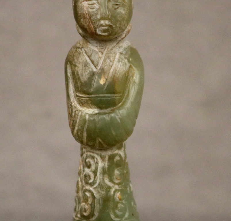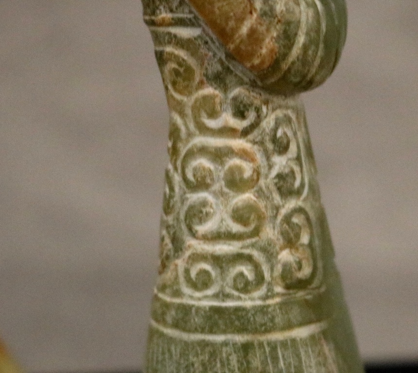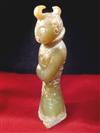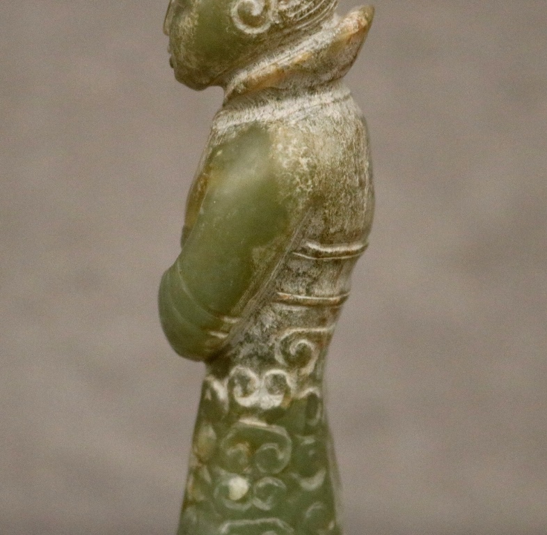 TWO CHINESE HAN DYNASTY FIGURINES. Two patinated and incised figurines as follows (1) a light green jade standing female figure. Han dynasty. Height: 13 cm, 5 2/16 inches; and (2) a light green and russet jade figure of a dancer. Han dynasty. Length: 10 cm, 4 inches. Note: The Han dynasty was a Chinese imperial dynasty that ruled from 206 BCE to 220 CE. NOTE: A copy of the consignor's purchase receipt will be provided upon request. Estimate $400-600 PROVENANCE: Acquired in the early 1990s from Frank H. Crane's "The Hundred Antiques" store (Stirling, Ontario, Canada). Mr. Crane was a frequent visitor to Hong Kong where he acquired Archaic jades mainly from Mr. Lai Loy's well known and prominent shop near the Man Mo Temple on Hollywood Road. Mr. Lai (Chinese, 1926-2012) was the descendent of antique dealers from Guangzhou, China. In 2005, stones from the collection were verbally authenticated by Dr. Sarah Milledge Nelson (American, 1931 - 2020), a noted archaeologist and Distinguished Professor Emerita from the Department of Anthropology, University of Denver.
