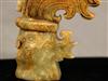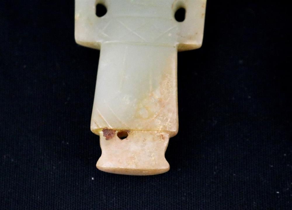 TWO CHINESE SHANG DYNASTY PENDANTS. Lot comprises of patinated and incised (1) celadon jade standing figure with a head dress. Shang dynasty Height: 8.5 cm, 3 2/16 inches. Reference: similar jades from the Fu Hao tomb 1200 BC; and (2) greenish yellow jade ornament in the shape of a human head with a crown. Shang dynasty. Height: 7.2 cm, 2 9/16 inches. Reference: "Chinese Jade Selected articles from Orientations 1983-1996" "Shang dynasty Zoomorphic Jades" by Yang Jianfang p. 17, fig. 15. Note: The Shang dynasty, also known as the Yin dynasty, was a Chinese royal dynasty that ruled in the Yellow River valley during the second millennium BC, traditionally succeeding the Xia dynasty and followed by the Western Zhou dynasty. Modern scholarship dates the dynasty between the 16th and 11th centuries BC, with more agreement surrounding the end date than beginning date. NOTE: A copy of the consignor's purchase receipt will be provided upon request. Estimate $400-600 PROVENANCE: Acquired in the early 1990s from Frank H. Crane's "The Hundred Antiques" store (Stirling, Ontario, Canada). Mr. Crane was a frequent visitor to Hong Kong where he acquired Archaic jades mainly from Mr. Lai Loy's well known and prominent shop near the Man Mo Temple on Hollywood Road. Mr. Lai (Chinese, 1926-2012) was the descendent of antique dealers from Guangzhou, China. In 2005, stones from the collection were verbally authenticated by Dr. Sarah Milledge Nelson (American, 1931 - 2020), a noted archaeologist and Distinguished Professor Emerita from the Department of Anthropology, University of Denver.