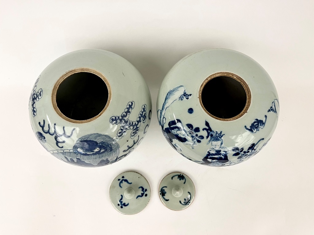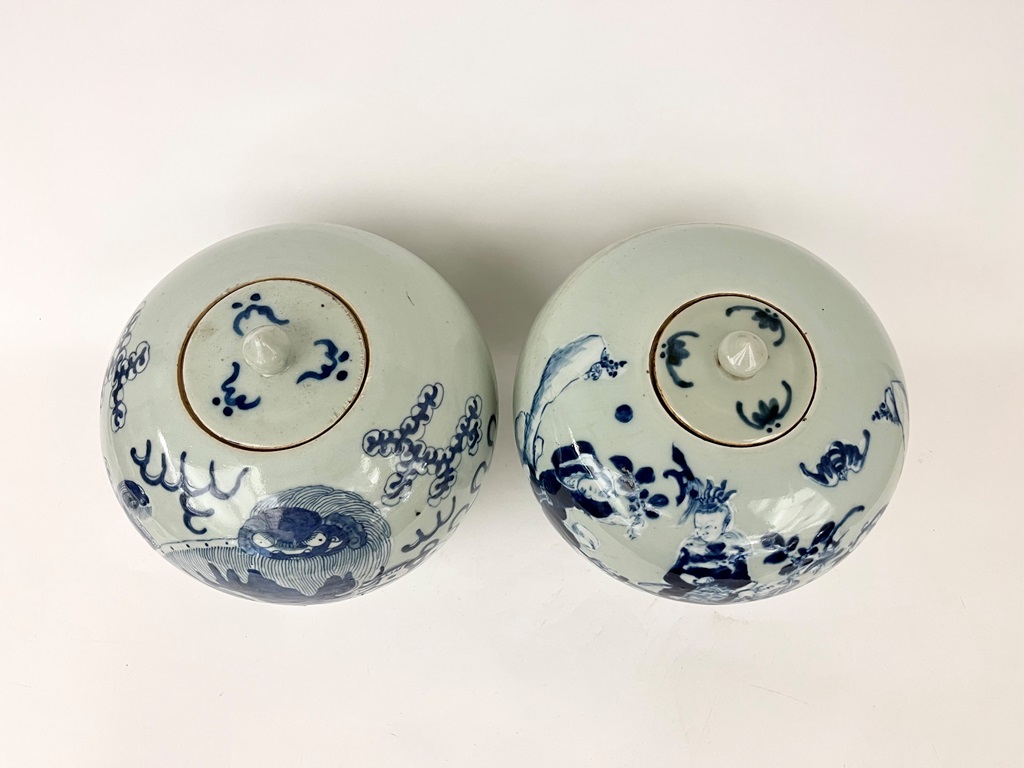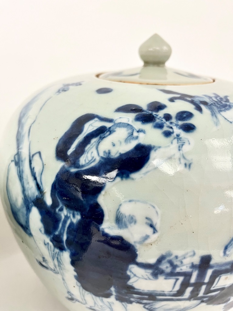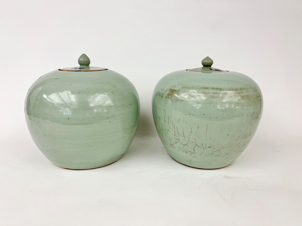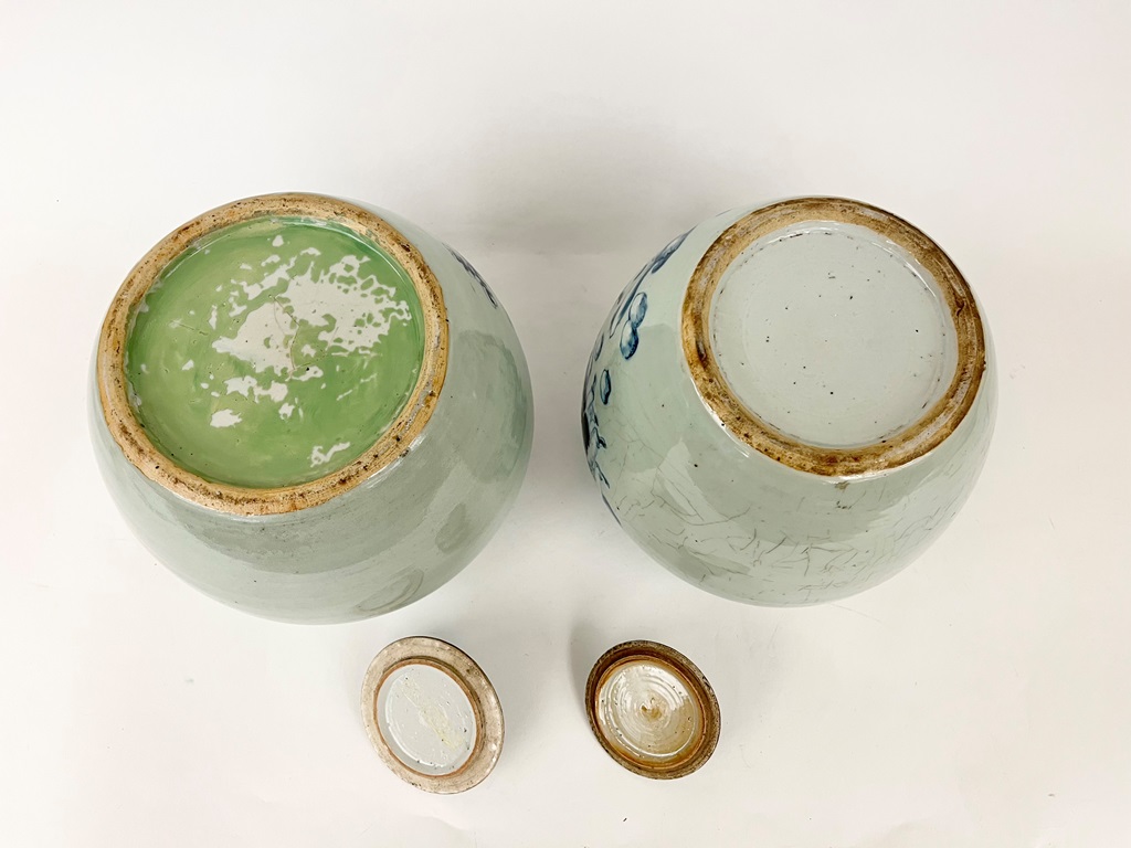 TWO SIMILAR 19TH CENTURY CHINESE LIFT-COVER APPLE-FORM PORCELAIN JARS . Blue and white figural decoration on celadon ground. Larger, H: 9 1/4 in.Estimate $100-200