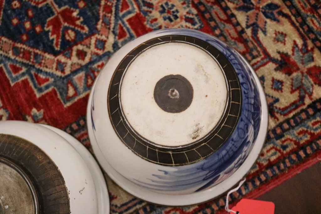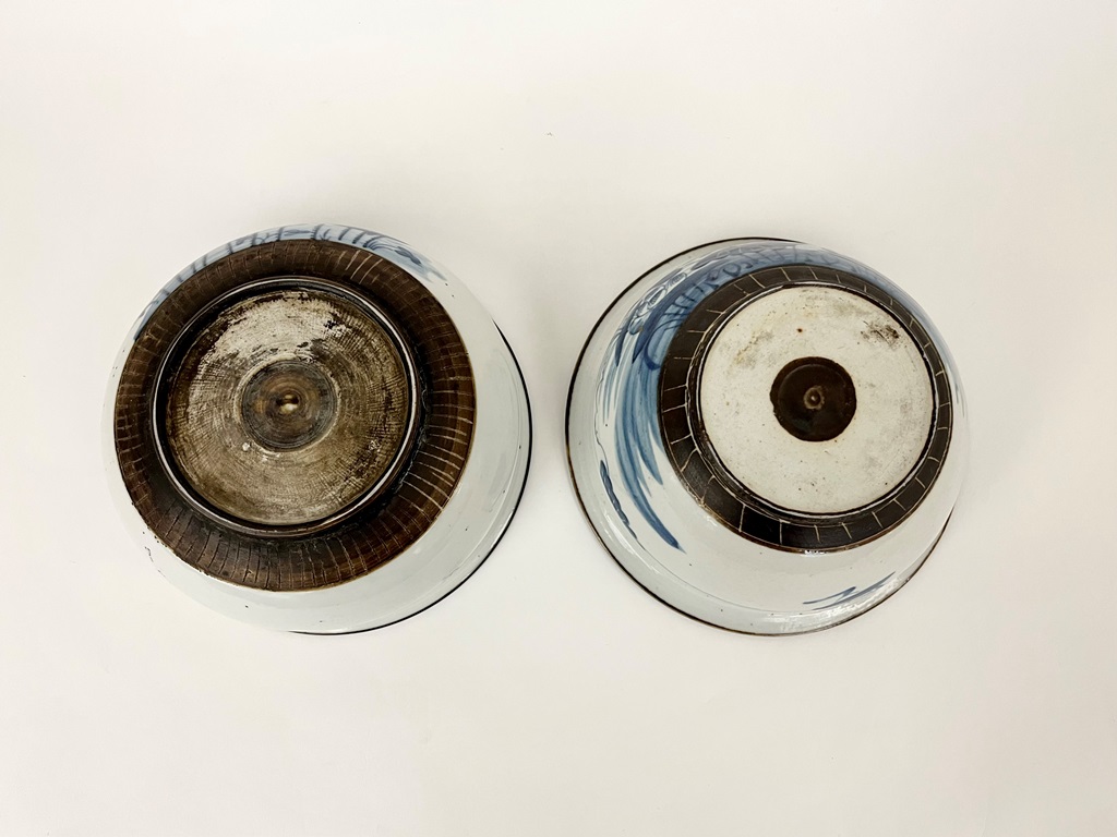 TWO SIMILAR CHINESE BLUE AND WHITE PORCELAIN BOWLS DECORATED WITH FLOWERING PLANTS. - Larger, D: 8 1/8".Estimate $100-150