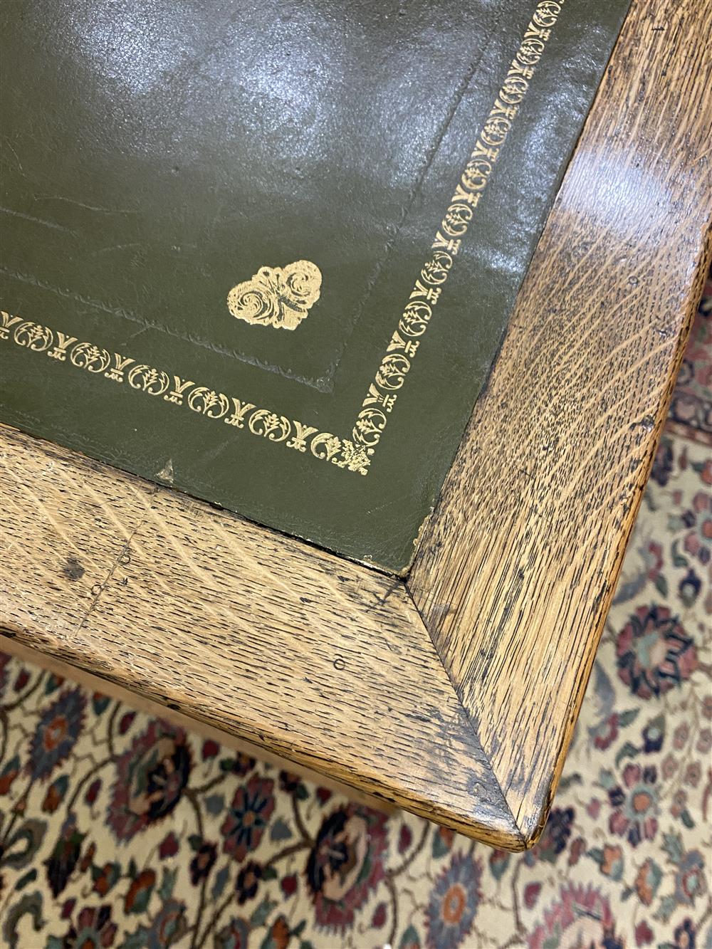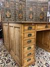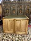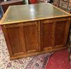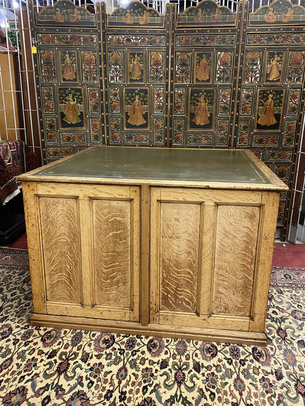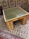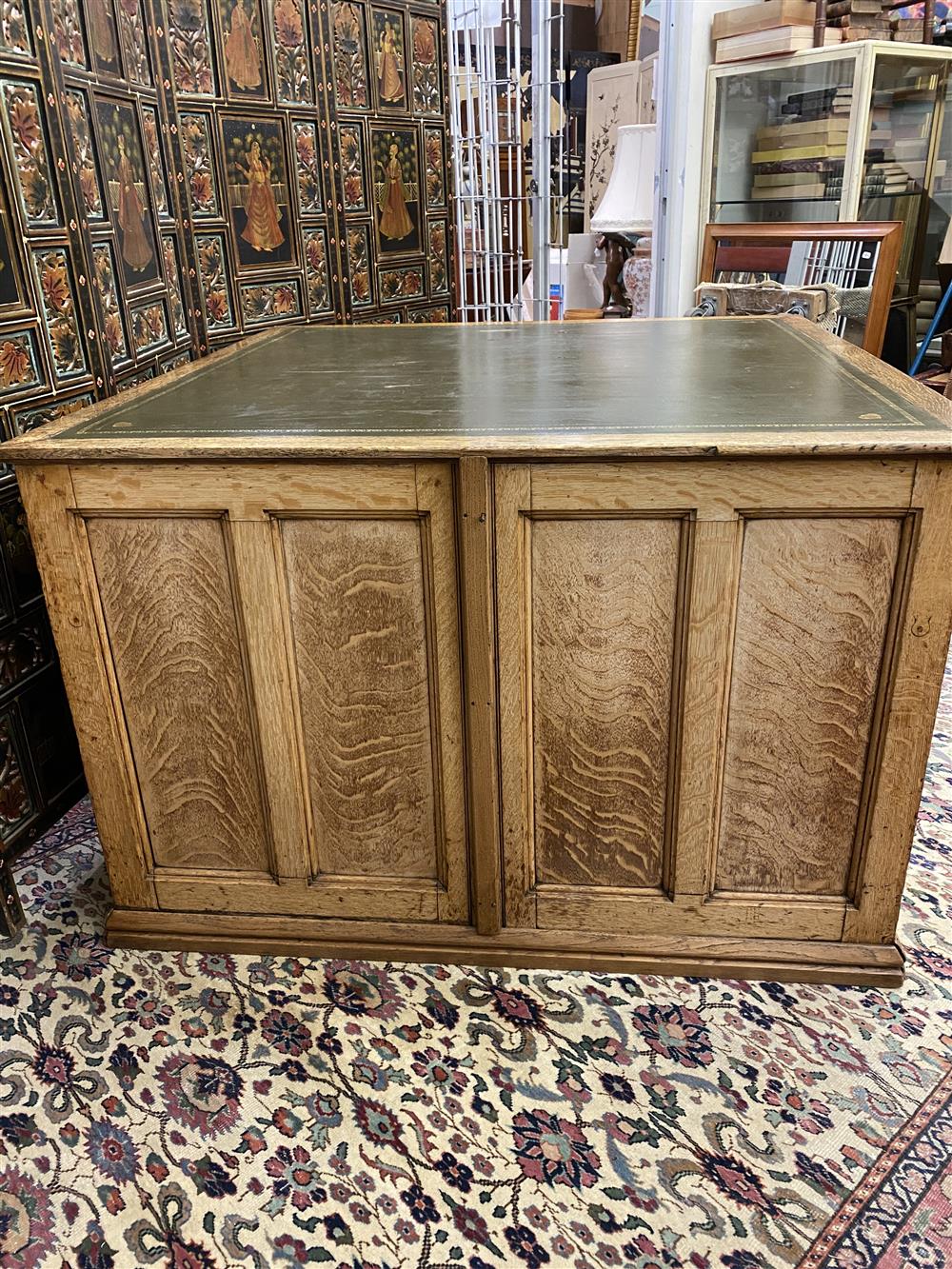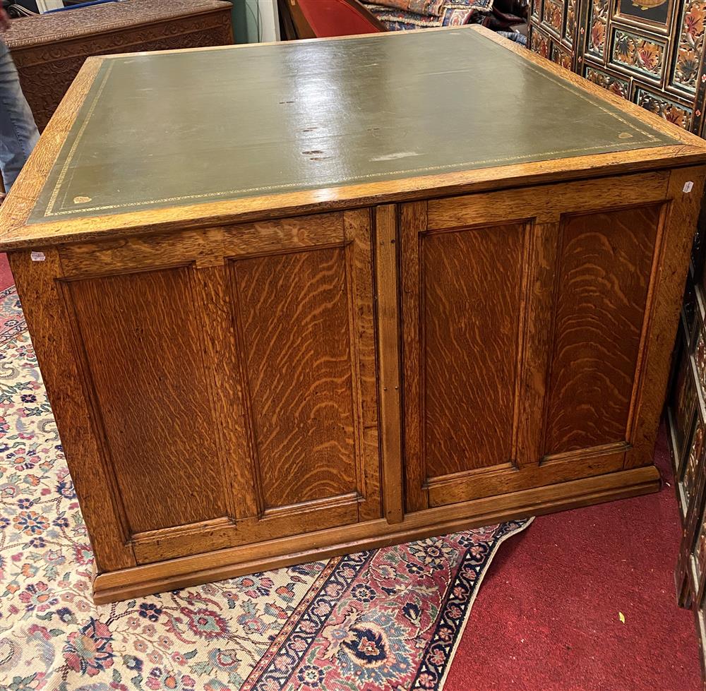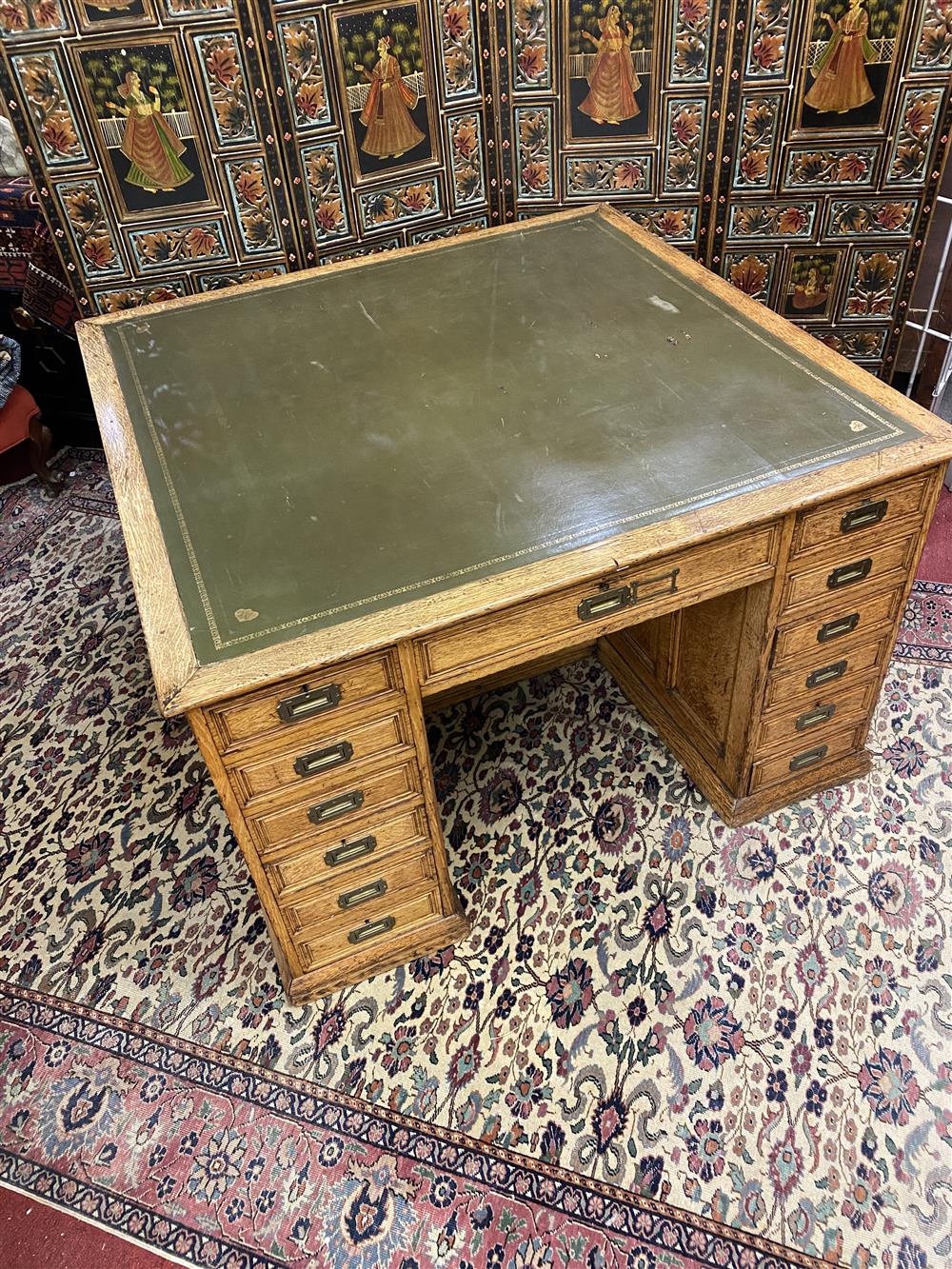 UNUSUAL ENGLISH SQUARE GOLDEN OAK PARTNER'S DESK. late 19th century. Gold-tooled green leather inset writing surface; kneeholes each centered by 13 paneled drawers fitted with recessed brass bail-handle pulls - H: 31 1/2 in. Top, 49 1/2 in. square. Estimate $800-1,200