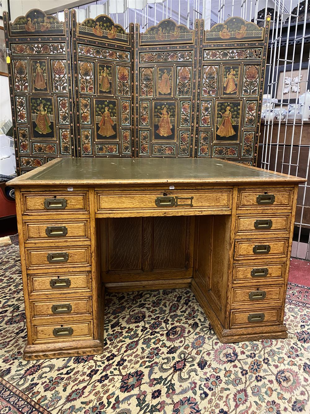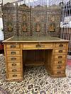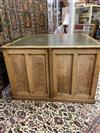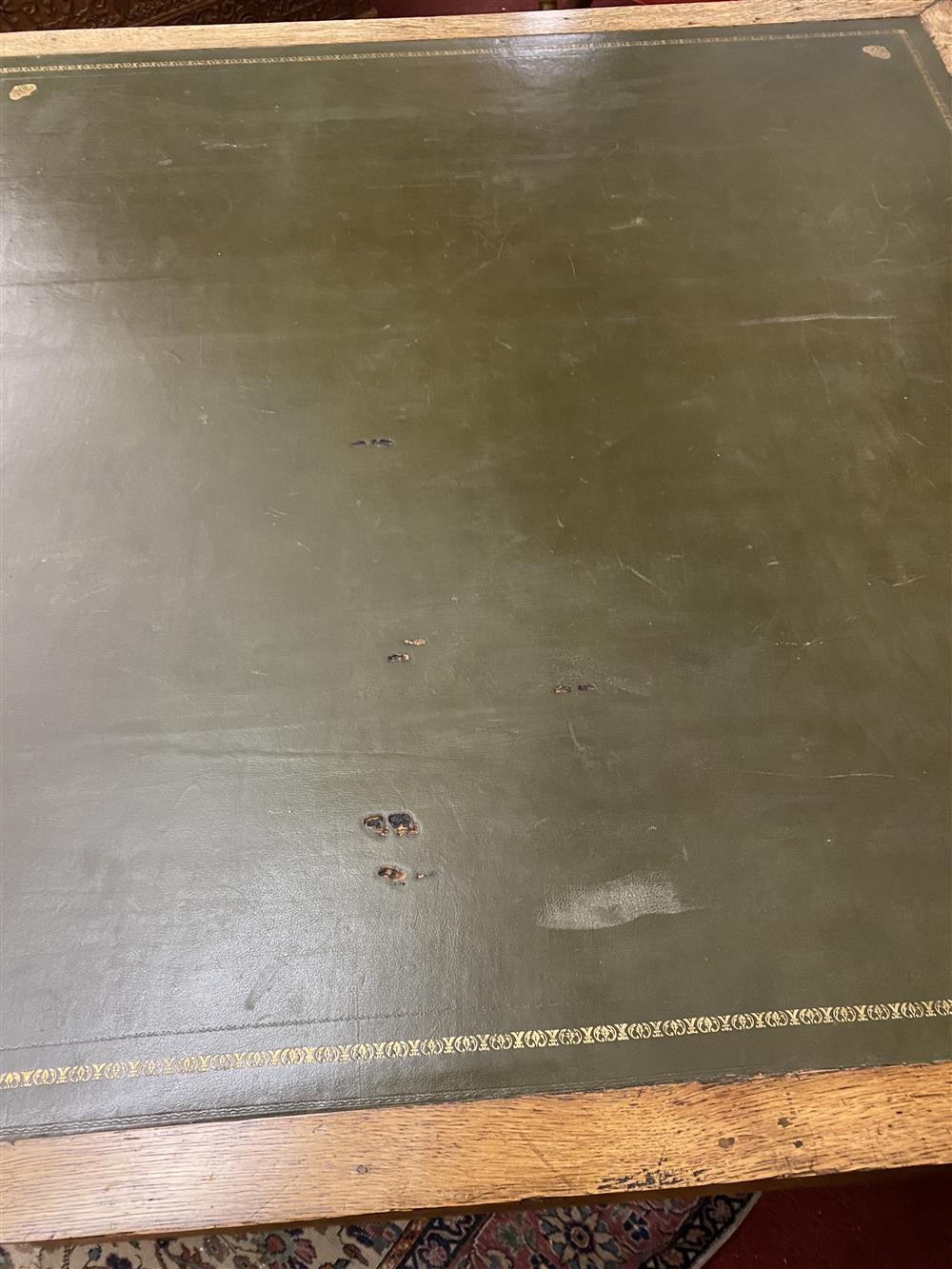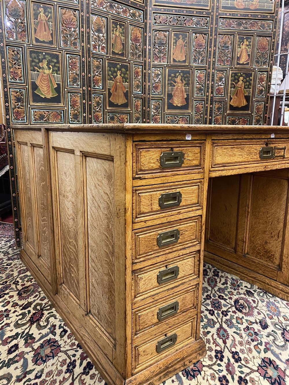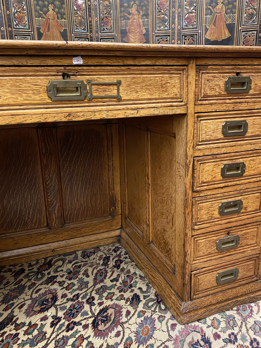 UNUSUAL ENGLISH SQUARE GOLDEN OAK PARTNER'S DESK. late 19th century. Gold-tooled green leather inset writing surface; kneeholes each centered by 13 paneled drawers fitted with recessed brass bail-handle pulls - H: 31 1/2 in. Top, 49 1/2 in. square. Estimate $800-1,200