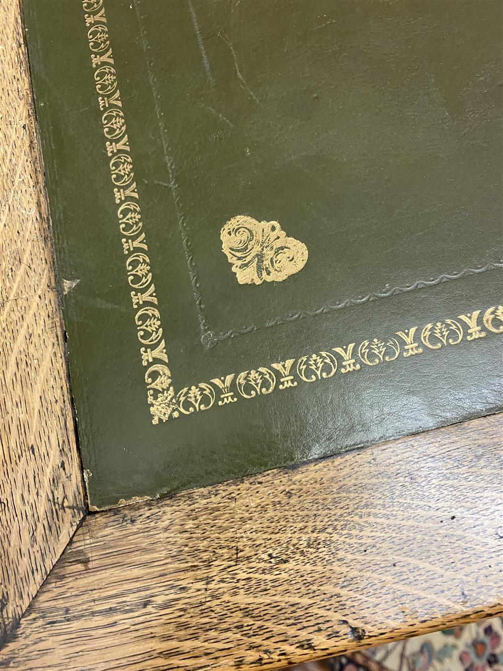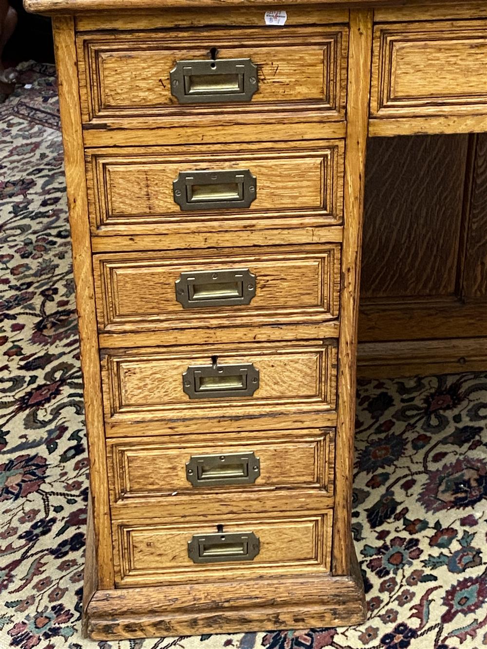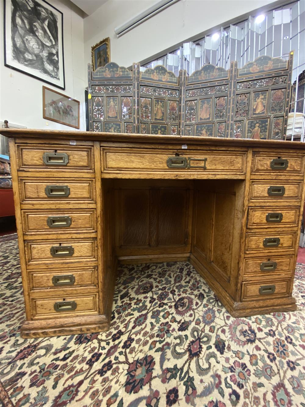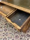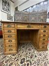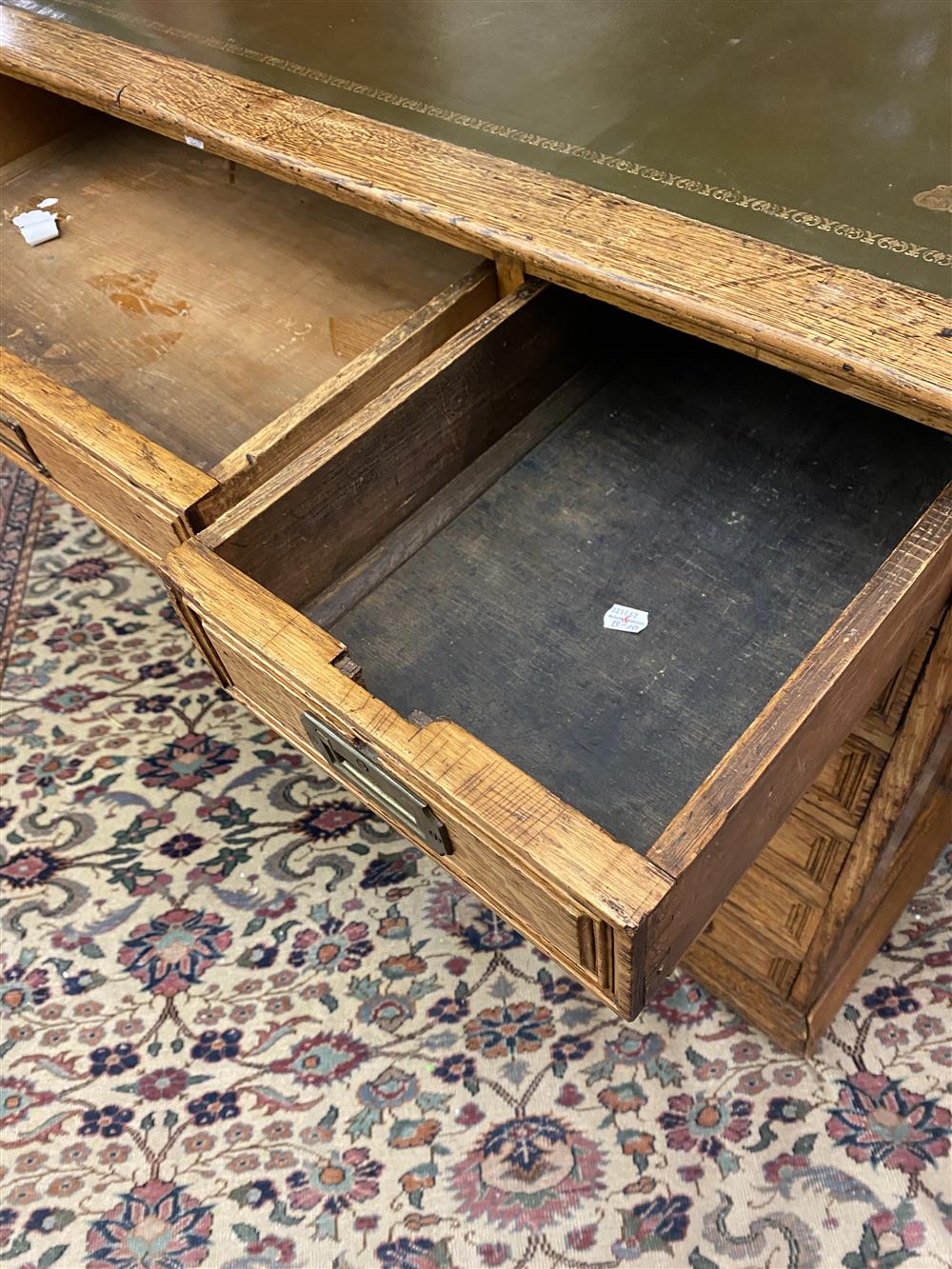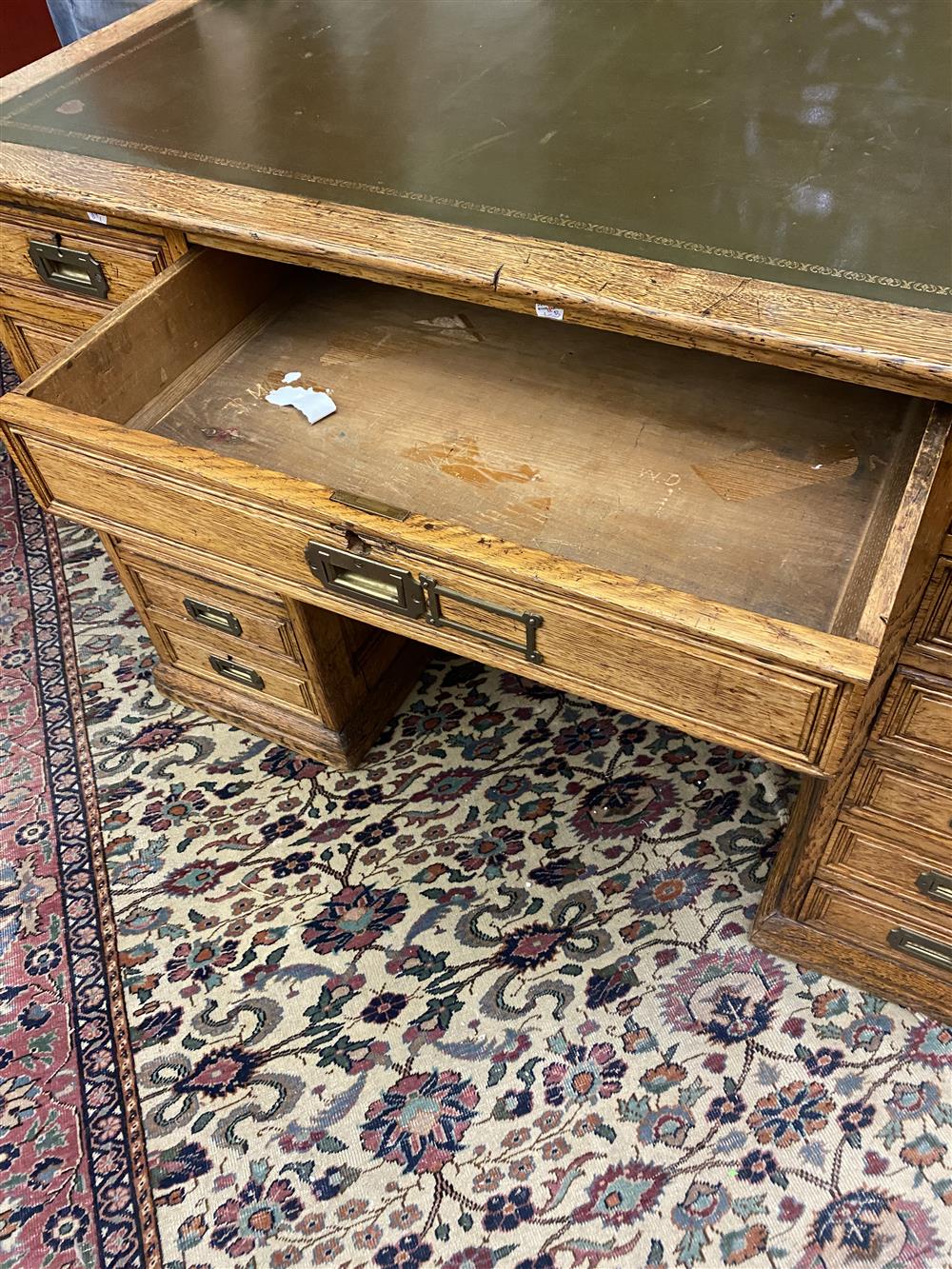 UNUSUAL ENGLISH SQUARE GOLDEN OAK PARTNER'S DESK. late 19th century. Gold-tooled green leather inset writing surface; kneeholes each centered by 13 paneled drawers fitted with recessed brass bail-handle pulls - H: 31 1/2 in. Top, 49 1/2 in. square. Estimate $800-1,200