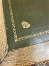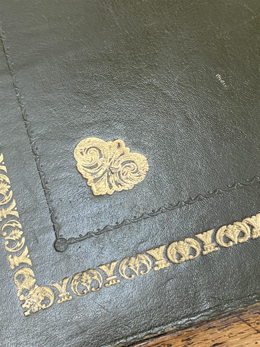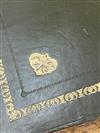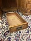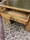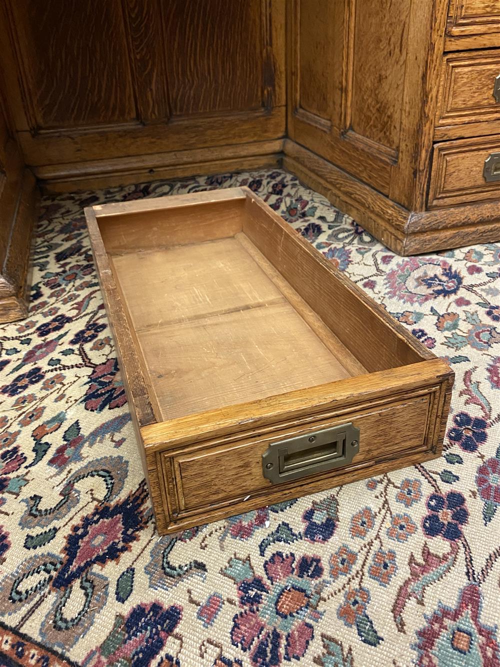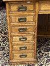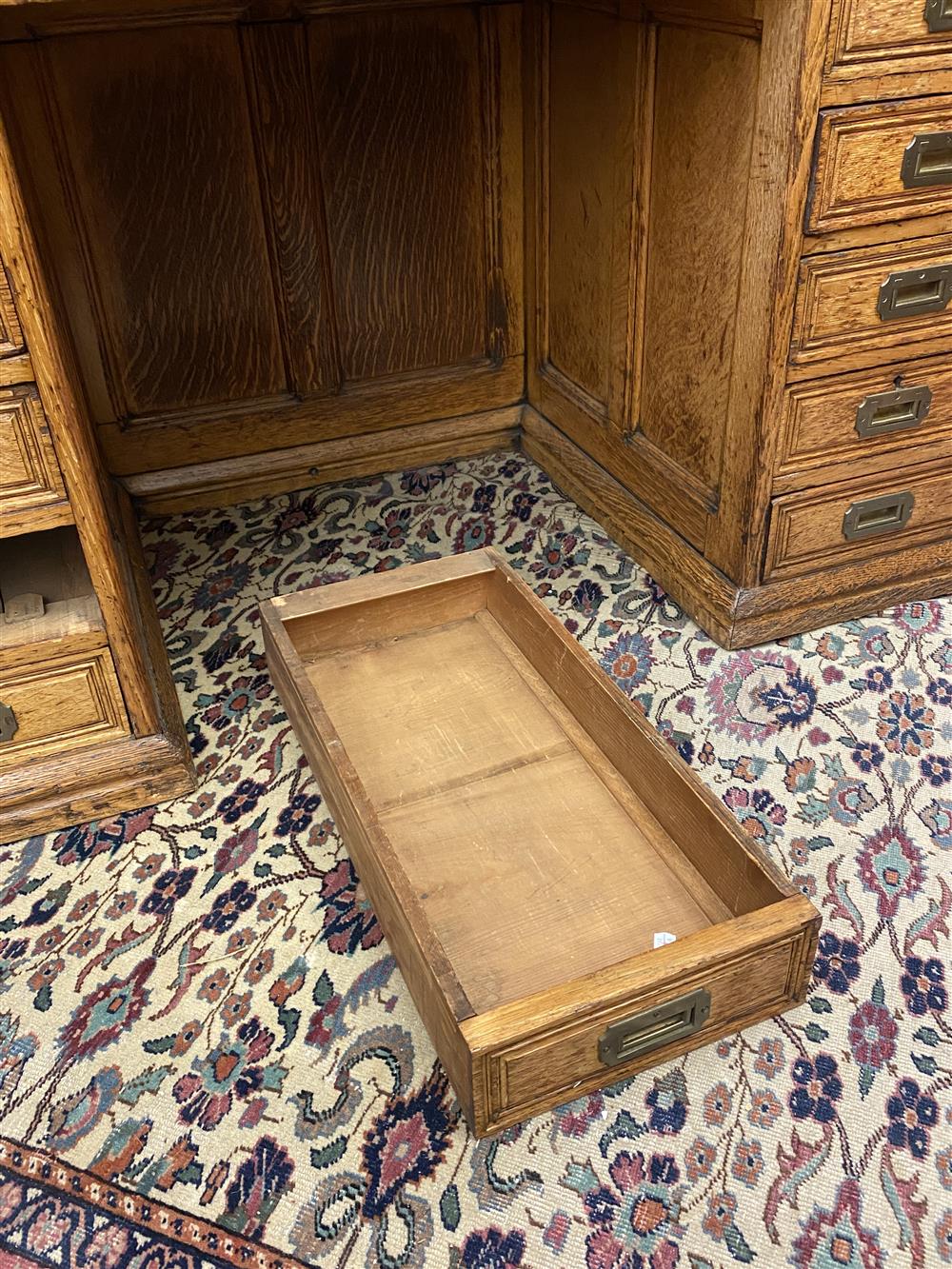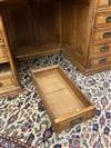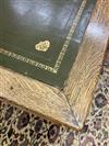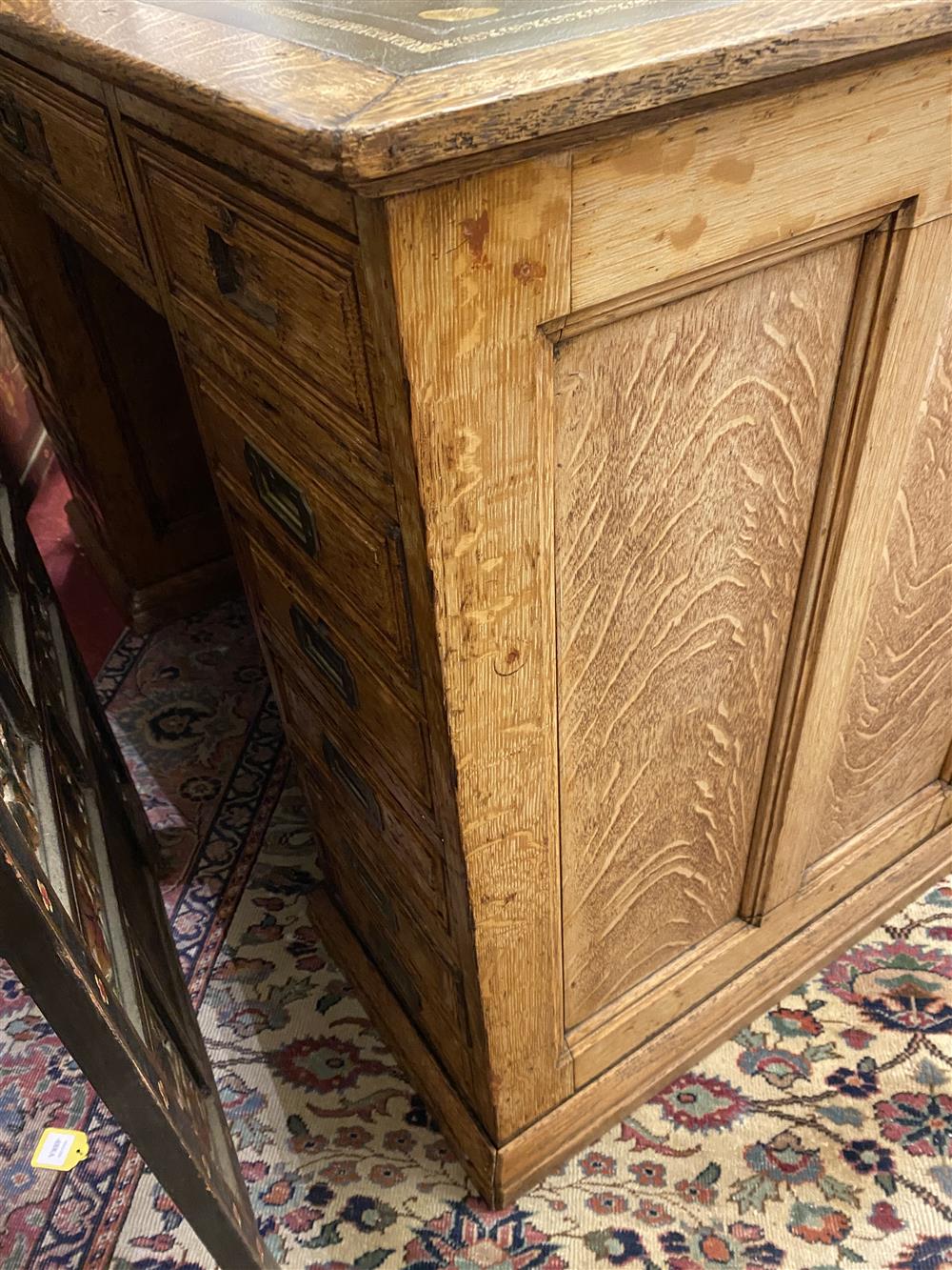 UNUSUAL ENGLISH SQUARE GOLDEN OAK PARTNER'S DESK. late 19th century. Gold-tooled green leather inset writing surface; kneeholes each centered by 13 paneled drawers fitted with recessed brass bail-handle pulls - H: 31 1/2 in. Top, 49 1/2 in. square. Estimate $800-1,200