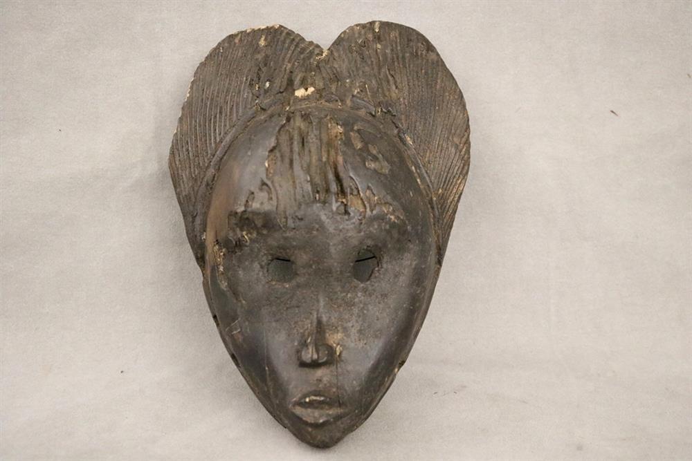 ZAMBIAN LUVALE MAKISHI MASQUERADE MUKANDA MASK. Patinated wooden mask used at the conclusion of the mukanda, an annual initiation ceremony for boys aged eight to twelve among the Luvale, Chokwe, Luchazi, and Mbunda peoples of Zambia. The mask itself represents a spirit, often a deceased ancestor, who returns to the world of the living to assist the boys during the initiation process. -