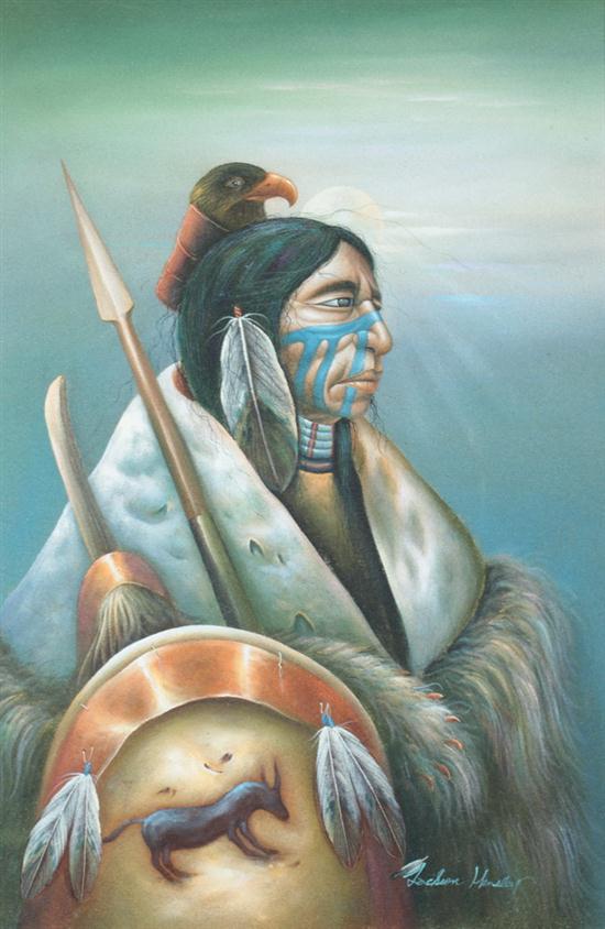 Sale 75 Lot 1097 JACKSON MOREY HENSLEY (New Mexico, b. 1940). INDIAN, signed lower right. Oil on canvas. - Framed, 36 in. x 24 in. Estimate $2,000-5,000 A Plains Indian, Perhaps, Sioux, Wearing Face Paint And Holding A Spear And A Shield. Unsold
