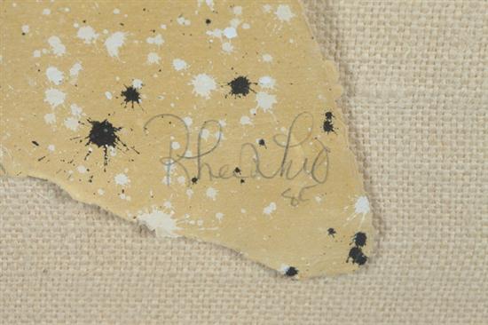 AMERICAN INDIAN SCHOOL (20th Century). A PLAINS INDIAN WOMAN'S DRESS, signed and dated "(19)85" lower right. Mixed media collage. - In clear plastic case frame, 31 1/2 in. x 45 1/2 in.