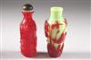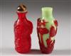 TWO CHINESE PEKING GLASS SNUFF BOTTLES. One of ovoid form carved to depict fishermen and lilies, other red glass with a dragon decoration.