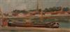 CANADIAN SCHOOL (19th/20th century). CANAL BARGE AT DOCK, Noted indistinctly "Christmas - Montreal" (?) Oil on board C - Framed, 8 in. x 17 1/4 in. Estimate $200-400