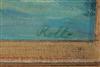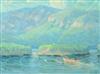 AUGUST HERMAN OLSON ROLLE. (Minnesota/Washington D.C., 1875-1941). MOTORBOAT APPROACHING ISLES IN LARGE RIVER WITH MOUNTAINS IN DISTANCE, signed lower right and lower left. Circa 1925-1925. Oil on board