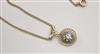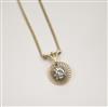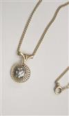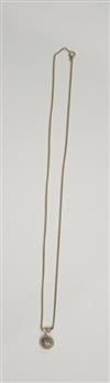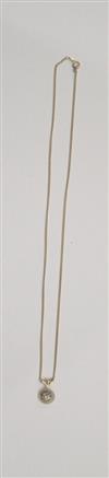 14K YELLOW AND WHITE GOLD AND DIAMOND PENDANT ON CHAIN. Brilliant-cut round diamond weighin app.. .20 ct centered in white gold head within pierced circular setting 16 in. 14K gold pendant chainEstimate $150-200