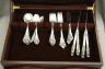 93-PIECES WALLACE CO. "GRAND BAROQUE" PATTERN STERLING SILVER FLATWARE Including 16 knives, 15 dinner forks,16 dessert forks, 12 soup spoons, 15 teaspoons, 12 butter knives, 1 cake server, 1 cold meat fork, 1 serving spoon, 1 serving spoon with shell-form bowl (berry spoon), 1 master butter knife, 1 serving fork, 1 sugar spoon. Weighable silver (excluding 28 knives and six sterling-handle serving implements): 92 troy oz. Gross wt. of service: 173 oz. $5,000-6,000