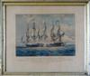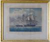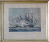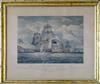 AFTER JOHN CHRISTIAN SCHETKY, ESQ (British, 1778-1874). H.M.S. Shannon Commencing Battle with The American Frigate Chesapeake on 1st June 1813", and the three other scenes of Chesapeake and Shannon, Complete set of four hand-colored stone lithographs on wove paper. 1830. Published London by Smith Elder & Co., Cornhill. Printed by Day. With titles, text, margins, and plate numbers (1 - 4) Gilt frames, with 19th century rippled glass. Old rippled 19th century glass. . - 18 1/4 x 20 1/4 in; frame: 21 1/4 x 25 1/4 Estimate $600-800 Condition: discolored paper and other imperfections. (Note: lithographs not removed from frames for inspection).