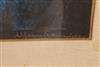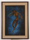 ALFONSO BENAVIDES (20th Century). Female Nude Dancing, Signed lower right. Oil on paper. In palette of gold and black against bright blue ground. Sight size as matted and framed, 20 3/4" x 14". Mid-century modern, mahogany-finish plain wooden frame with canted sides. Estimate $100-200