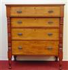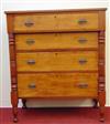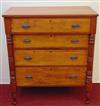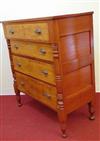 AMERICAN LATE SHERATON CHERRY AND TIGER MAPLE FOUR-DRAWER CHEST, NEW ENGLAND, 19th century. Four graduated drawers centered by ring-turned split columns. - H: 46 in.; W: 40 3/4 in.; D; 19 1/2 in.Estimate $250-450