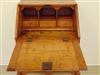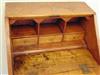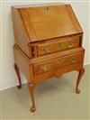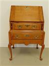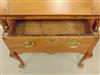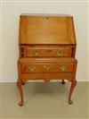 AMERICAN QUEEN ANNE MAPLE AND TIGER MAPLE DESK-ON-FRAME, 1740-1760. Slant front with breadboard ends opens to writing compartment fitted with three pigeonholes over three aligned drawers; above one full-width drawer; frame fitted with full-width drawers over shaped apron; cabriole legs end on pad feet. - H: 38 1/2 in.; W: 25 5/8; D: 18 15/16 in. Estimate $400-600