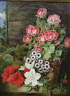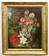 AMERICAN SCHOOL (Late 19th Century). Early Spring Flowers, Oil on canvas. Signed with initial "GH" or "GM" monogram in lower right corner. Framed. - 14.5" x 11.5"; Frame: 18.5" x 15.75"Estimate $350-450