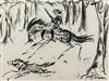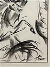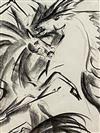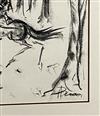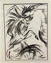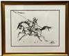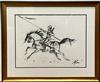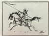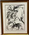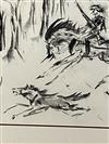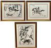 ANDRZEJ PITYNSKI Polish / American, 1947–2020 Three Works: Two Mounted Knights and a Fierce Horse, 2000. Charcoal on paper. Each one signed "AP" and dated 2000. Set of three framed charcoal drawings created in a dynamic, expressive style. The pieces depict dramatic, action-packed medieval or fantasy scenes, rendered primarily in black and white with strong contrasts and energetic line work. The top left drawing shows a mounted knight in a wooded setting, possibly engaged in a chase or hunt, with a wolf or dog running in the foreground. The top right drawing features a knight on horseback, wearing armor and carrying a lance or banner, captured in a pose suggesting a charge or movement across an open field. The bottom drawing is the most fantastical, portraying a fierce horse rearing up, rendered with powerful shadows and exaggerated, menacing features. Each is framed individually. Not examined out of frame.