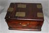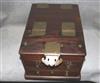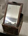 ANTIQUE CHINESE TRAVELING BRIDE'S BOX. Brass mounts; bail side handles; hinged top opens to easel-back mirrorFitted with 3 drawers - H: 8 1/4 in. D: 15 3/4 in. W: 11 1/2 in.$150-250
