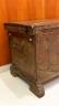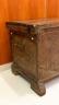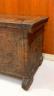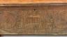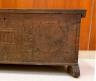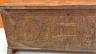 ANTIQUE CARVED WOODEN CYPRIOT COFFER (SINDUKI) A traditional Cypriot wooden coffer, or sinduki, serves as a vital artifact of the island's folk heritage, historically functioning as a bride’s dowry chest to store valuable linens, silks, and embroideries. These chests are typically crafted from durable local woods like pine or walnut and are characterized by elaborate high-relief carvings on their front panels. Common decorative motifs include stylized architectural elements, such as churches or temples, flanked by large radiating solar rosettes that symbolize eternity or divine protection. Ornate vertical bands of floral patterns and geometric borders further enhance the design, with the complexity of the craftsmanship often reflecting the social standing of the family. Resting on sturdy block feet to protect the contents from damp floors, these chests were produced in prominent woodworking centers like Lapithos and remain celebrated symbols of Cypriot domestic life and artisanal skill. Height: 18 inches (excluding feet); length: 43 inches