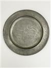 ANTIQUE CONTINENTAL PEWTER CHARGER. Decorated with figure and shield. Hallmarked. - D; 14 3/4 in.Estimate $100-200