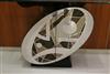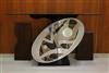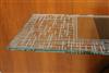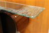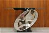 ARTISAN-CRAFTED MODERN CABINET/SIDEBOARD/BUFFET. Narrow rectangular, geometrically etched glass top rests on oval drum form, lacquered wooden angled base - H: 42". Top, 72" x 18".$1,000-1,500