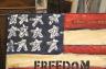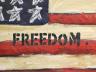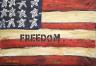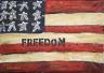 AMERICAN SCHOOL 20th Century Freedom Mixed media on canvas Mixed-media composition (signed J.O.) which serves as a patriotic tribute to both personal and creative liberties. The composition is set against a rough, textured interpretation of the American flag, featuring a blue canton with twelve hand-painted stars and expressive, thick-brushed red and white stripes. Stenciled in bold black block letters, the word "FREEDOM..." acts as the central focus, while smaller, faded phrases like "To Create," "To Speak Out," and "To Express" are scattered across the stripes. Unframed. 24 x 34 inches $200-300
