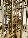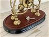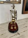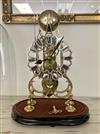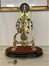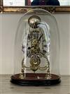 BRASS SKELETON MANTEL CLOCK UNDER GLASS DOME. Openwork silvered chapter ring with black enamel Roman numerals; with key; oval wooden plinth base. - H: 13 3/4", excluding dome.Estimate $200-300