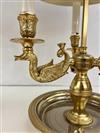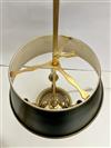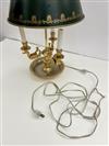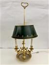 BRASS THREE-LIGHT BOUILLOTTE TABLE LAMP WITH GILT-STENCILED TOLEWARE SHADE. Nozzles rest on swan-form supports - H: 28 in.Estimate $250-350