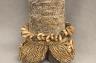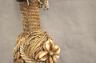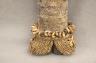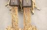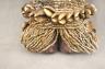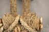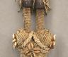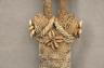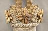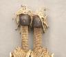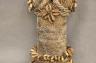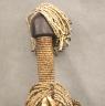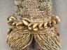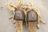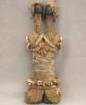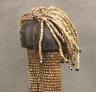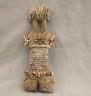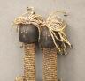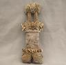 CAMEROONEAN FALI DUAL HEADED RITUAL DOLL This Fali ritual doll from northern Cameroon is a distinctive fertility figure characterized by its dense, meticulous ornamentation and symbolic form. Hand-constructed with a wooden or fiber core, the doll is almost entirely encased in thousands of tiny seed beads in muted earth tones, a labor-intensive design that reflects the sacred value of the object. The figure features a "Janus" or dual-headed composition, with two small, dark wooden heads adorned with beaded "hair" and delicate facial markings, while the torso is heavily embellished with cowrie shells arranged in floral and ring patterns—ancient symbols of wealth and procreation across Africa. Traditionally, these dolls were carried by young Fali women during betrothal or pregnancy, treated with maternal care to ensure the spiritual well-being of future children and to facilitate a successful transition into motherhood. height: 13 inches $100-120