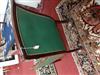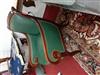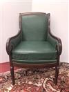 CARVED MAHOGANY LIBRARY ARMCHAIR WITH DARK GREEN LEATHER UPHOLSTERY AND BRASS NAILHEAD TRIM . Arms terminate in carved scrollsEstimate $200-300