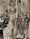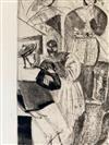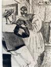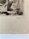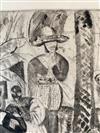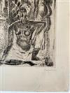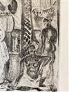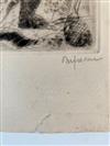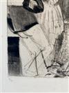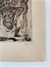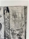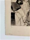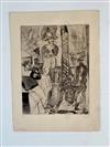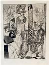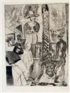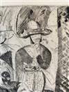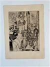 CHARLES DUFRESNE (French, 1876-1938). Le Planteur, circa 1919, Limited edition etching and drypoint numbered 12 of an edition of 35. Pencil numbered, titled, and artist signed at base. Blind stamp: E. Sagot Editeur, Paris. The artwork depicts "The Planter" as a tall, stern-looking man stands prominently in the center, identifiable as the European planter by his colonial-era attire and the Indigenous/African Figures (right and foreground) likely representing the local or enslaved people associated with the plantation. Prominently featured above the figures is a large sailing ship, often symbolizing the maritime trade, colonialism, or the journey (forced or otherwise) that brought the planter and the plantation workers together. Unframed. Not mounted or laid down. - Image: 9.25 x 7 inches; sheet: 12.5 x 9.25 inches $320-480