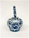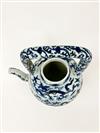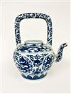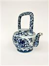 CHINESE BLUE AND WHITE PORCELAIN APPLE FORM TEAPOT. Rigid, squared handle; overall decoration of writhing dragons and trailing vines. - H: 12".Estimate $150-250