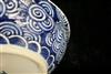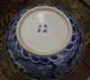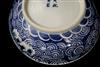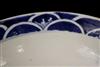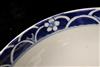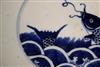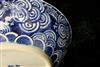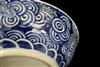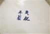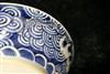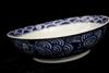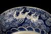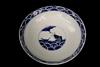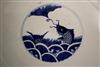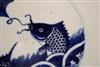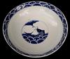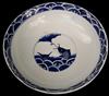CHINESE BLUE AND WHITE PORCELAIN CHENGHUA NIANZHI-STYLE SHALLOW BOWL. Cobalt blue underglaze painting on white porcelain body. Central medallion of stylized fish swimming in wave and nibbling on gingko leaf with a wide rim border of stylized waves and roundels with simple floral motifs. While the plate is 19th century, the base mark reads "Chenghua Nianzhi" or "Made in the Chenghua period" (1465-1487). - Diameter: 10.5 inches. $200-300