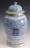 CHINESE BLUE AND WHITE PORCELAIN COVERED BALUSTER-FORM JAR. Character symbols amidst flowering vinesEstimate $200-300
