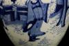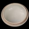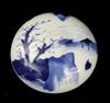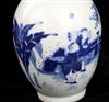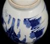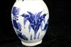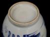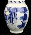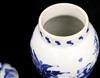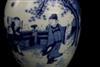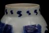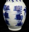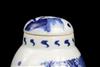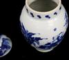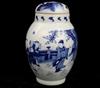 CHINESE BLUE AND WHITE PORCELAIN LOTUS SEED LIDDED JAR. 19th century. Squat, ovoid body tapering to footed base with separate, domed lid sometimes referred to as "hat lid". Cobalt blue underglaze scene of figures in garden, possibly scholars - H: 7 1/2 in. $200-300