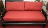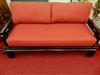 CHINESE EBONIZED CARVED WOODEN OPEN-ARM LOVESEAT. Geometrically-pierced arm supports; single red fabric upholstered seat cushion; pair back cushion. L: 64".Estimate $150-250