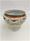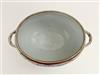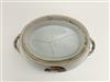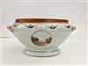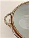 CHINESE EXPORT PORCELAIN OVAL TUREEN BASE, Federal Period, circa 1800-180. Circular reserves depicting manor house in landscape; palette of orange, gilt and sepia - L: 18 3/4 in., overall with handles. Estimate $50-100 Lacking cover. Base has spider cracks