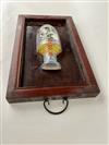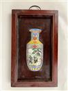 CHINESE FAMILLE ROSE PORCELAIN BALUSTER FORM WALL VASE CENTERED IN TEAKWOOD FRAME. Reserve of landscape decoration. - Frame, 17 3/4" x 10 3/4".Estimate $150-250