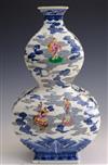 CHINESE FAMILLE ROSE PORCELAIN SQUARED DOUBLE-GOURD FORM VASE. Polychrome enamel decorated with sage and other figures amidst cloud banks. - H: 17 in.Estimate $300-500