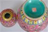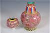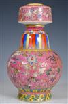 CHINESE FAMILLE ROSE PORCELAIN TWO-PART BALUSTER-FORM VASE. Polychromed floral decoration on strawberry pink ground; circular lift stopper - H: 11 in.Estimate $250-350