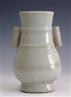 CHINESE GE-WARE MONOCHROME PORCELAIN VASE. Baluster-form vessel with cylindrical side handles; horizontal raised mid-bands; flaring oval ring foot - H: 9 1/4 in.Estimate $75-125