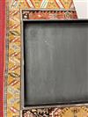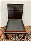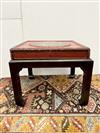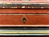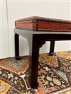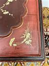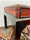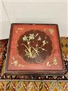 CHINESE GILT-FLORAL PAINTED AND RED LACQUERED HINGED-TOP BOX ON FITTED STAND. Top has foliate reserve enclosing flowers and butterfly centered by floral spandrels; black lacquered stand; protective glass top for use as side table. - H: 18 1/2"; 22 1/4" square. Estimate $150-250